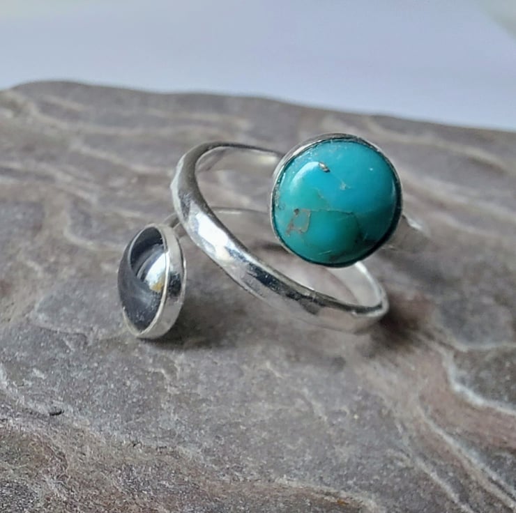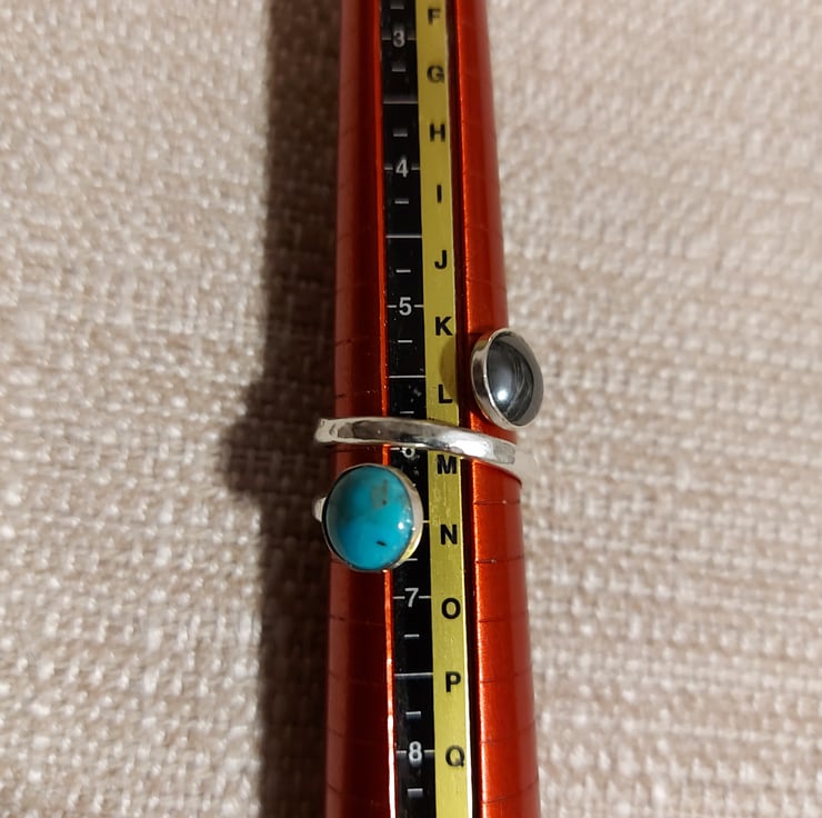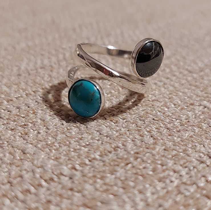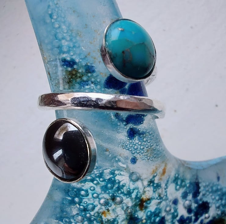 This unusual ring features a double length of sterling silver D-shaped wire, hammered to enhance its texture and sparkle. I soldered two 8mm round bezel cups onto the ends of the wire, then used a ring mandrel to form it into the desired shape - a little short of a double circle. At this stage the ring was tumble-polished for two hours to give it a bright shine. Then I added two 8mm round cabochons - one of howlite turquoise and one of the wonderfully glossy dark grey haematite. These stones are deliberately offset from the centre, with a strip of ring running diagonally between them.