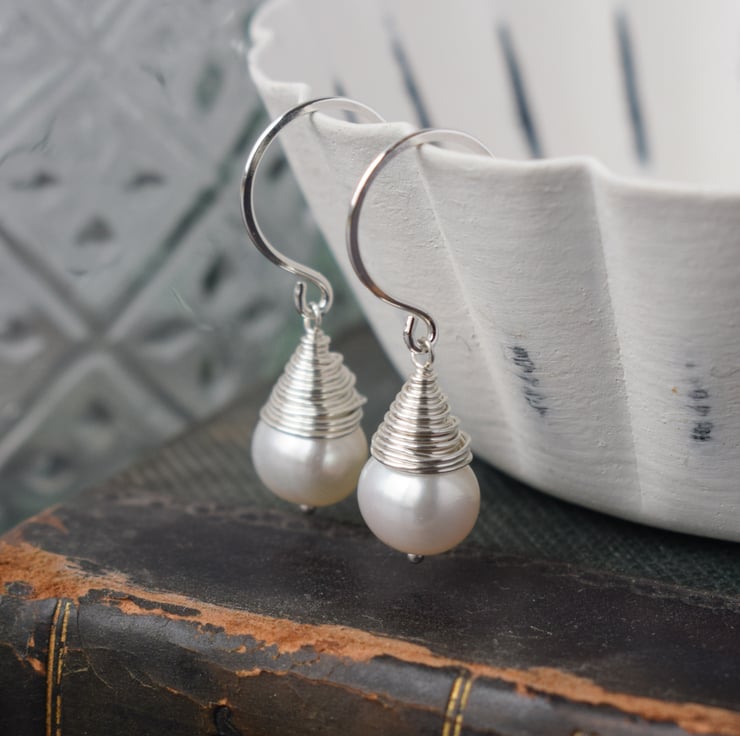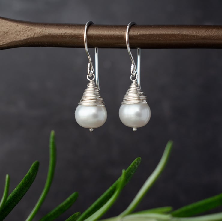These timeless earrings are created by wrapping thin silver wire around a single pearl to form a dainty teardrop shape. The bead is hung from a handcrafted ear wire for a true artisan finish.