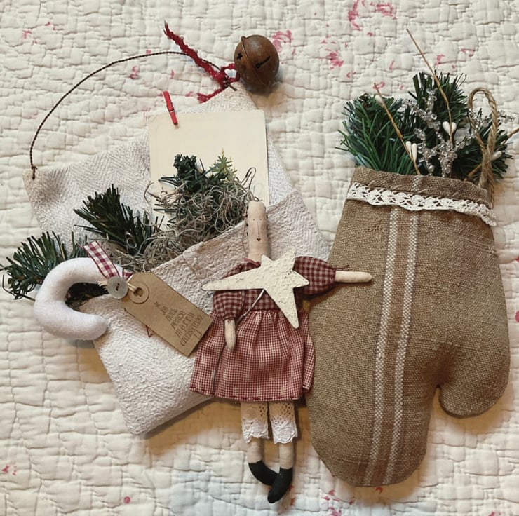They are filled with imitation fir, and two sprigs - one is sparkly, the other has ivory pip berries. The mitten hangs from a jute string loop on one side.