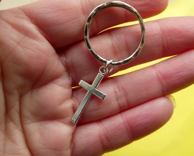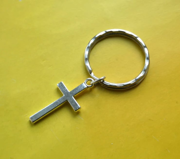 This listing is for a medium silver tone cross charm keyring with or without initial. Please select initial from the drop down menu if required.