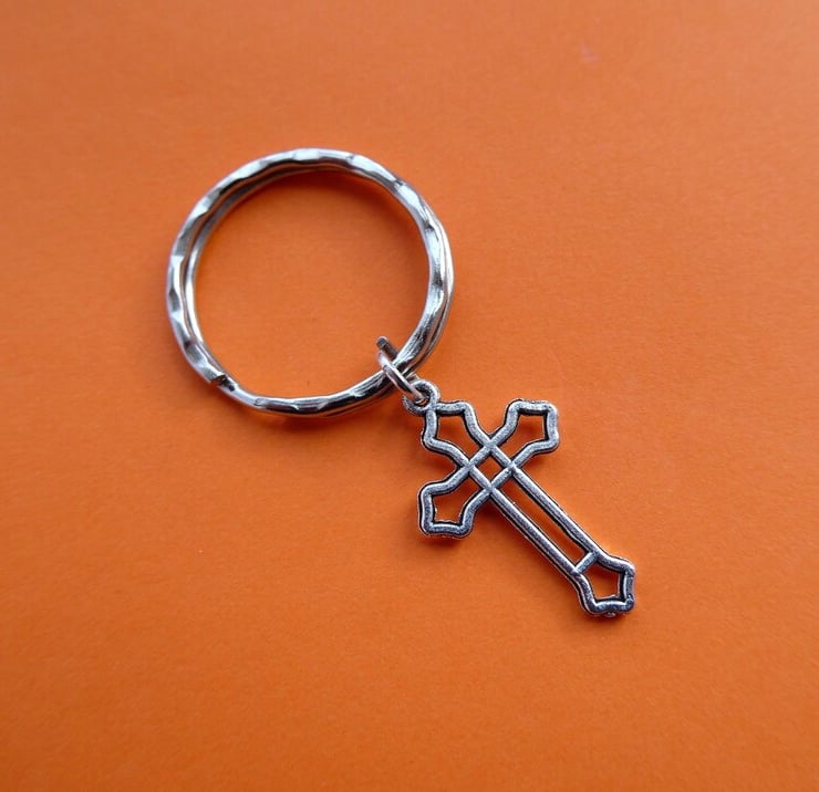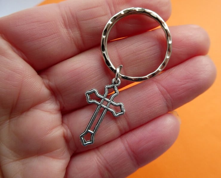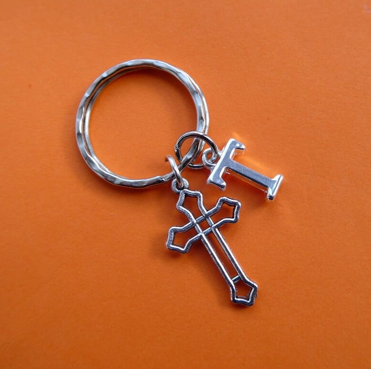 This listing is for a small silver tone open cross charm keyring with or without initial. Please select initial from the drop down menu if required.