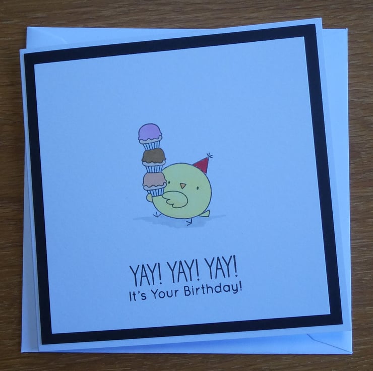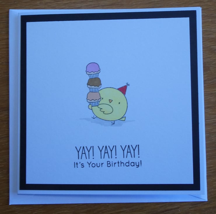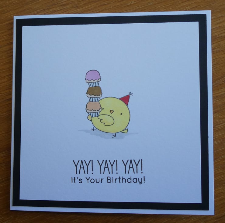 The design is mounted onto a frame of black card and finished with a message stamped in black archival ink which reads 'Yay! Yay! Yay! It's Your Birthday!'
