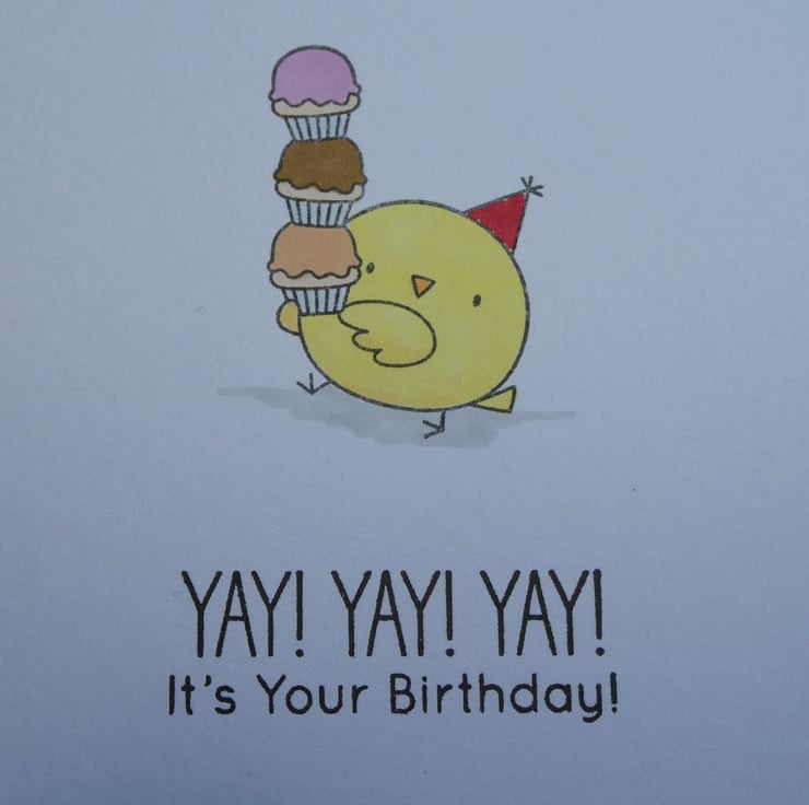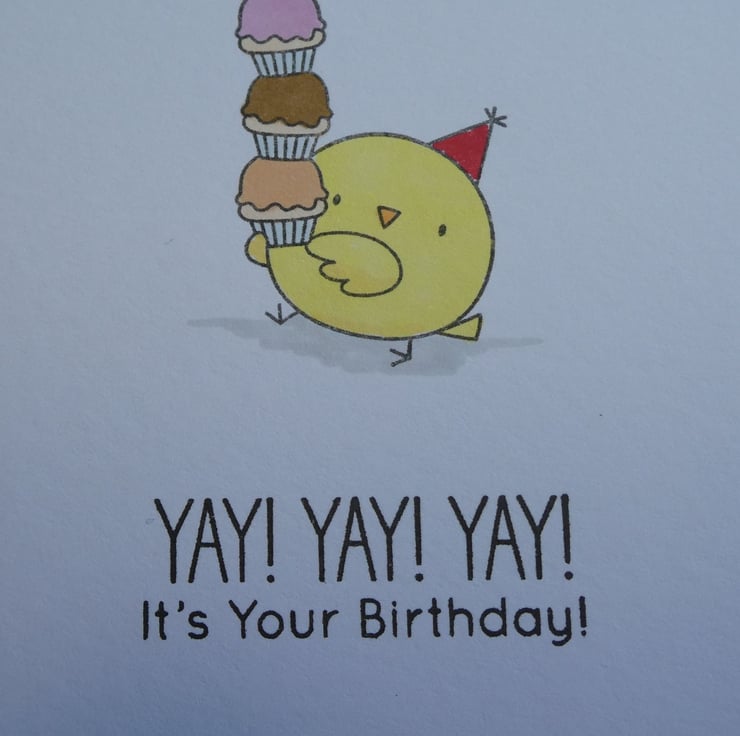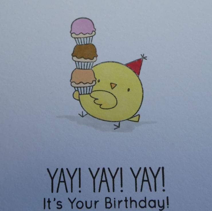 This cute birthday card card features a hand stamped and coloured image of a little chick carrying a pile of cupcakes.