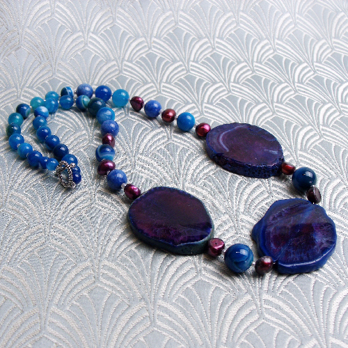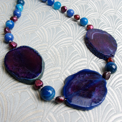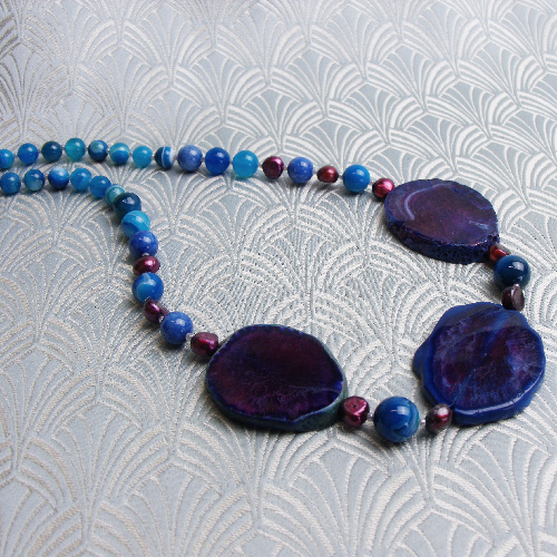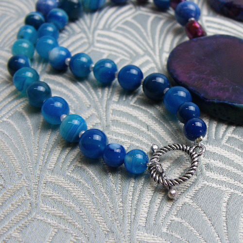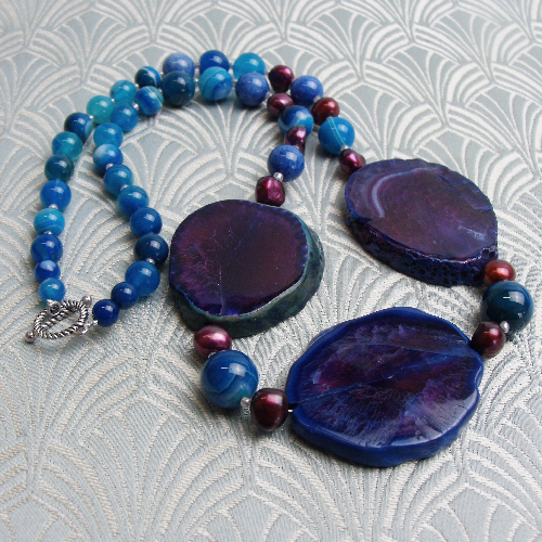 Each of these chunky blue semi-precious stone slabs have been framed with rich cranberry coloured freshwater pearls and these chunky semi-precious stone blue beads sit in the centre of a handmade blue semi-precious stone necklace that has been handmade from blue banded agate beads and with this chunky blue semi-precious stone chunky necklace I have used a toggle clasp as a fastener.
