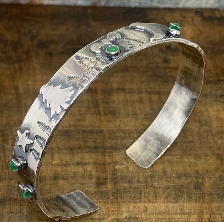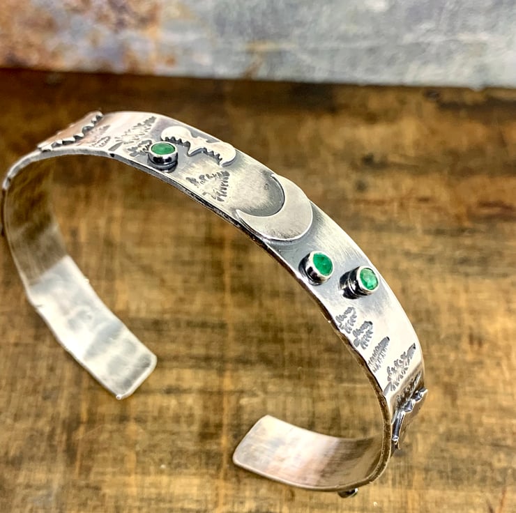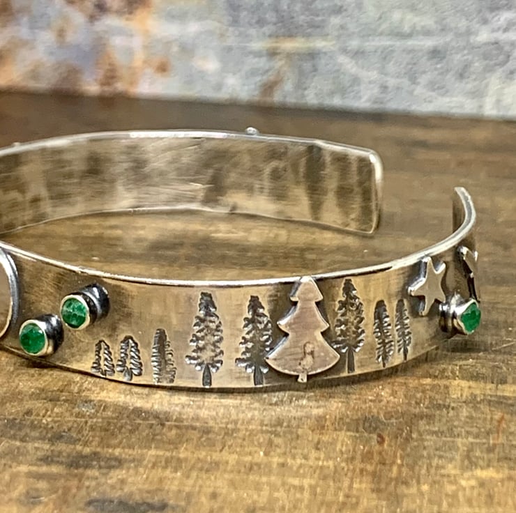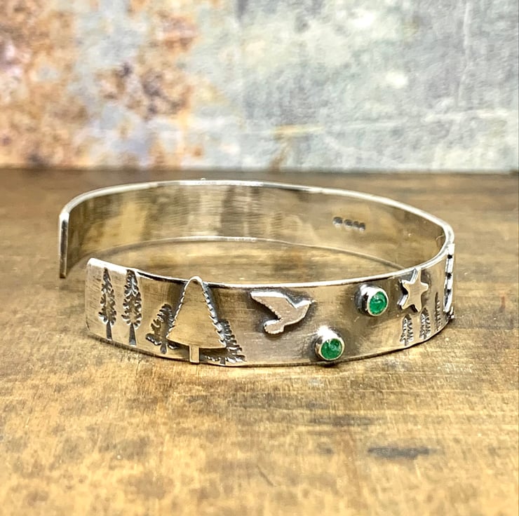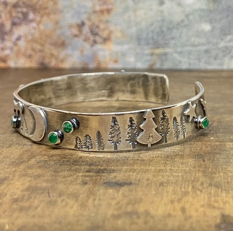 A Sterling Silver Handcrafted Cuff with a combination of nature inspired accents embossed trees and scattered with Six faceted Emeralds.
