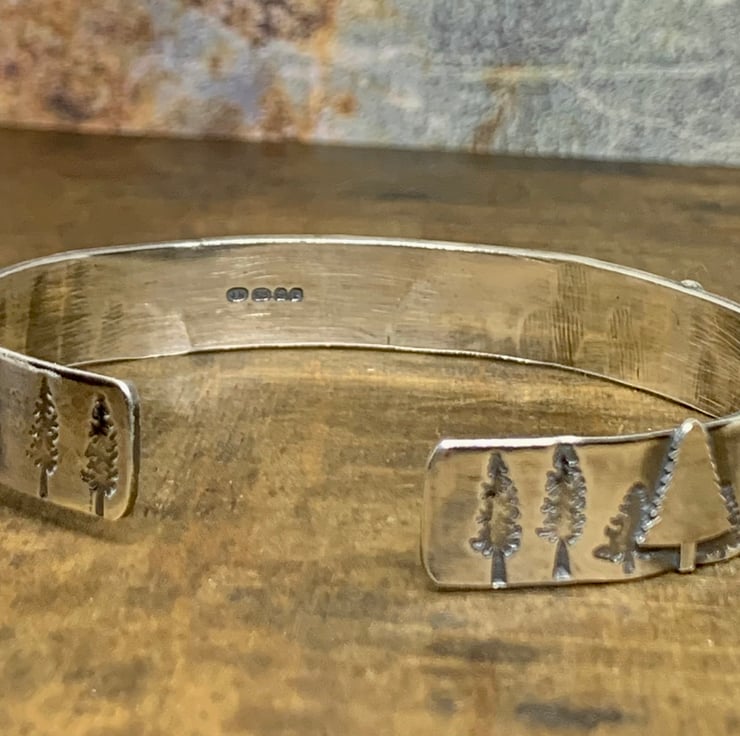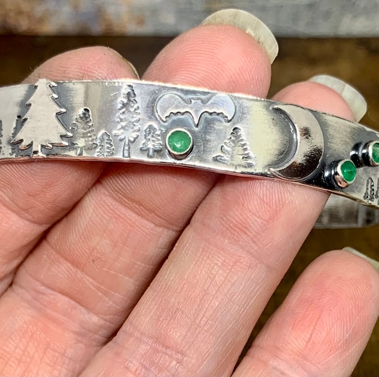 This cuff has been made using traditional methods, trees have been hand stamped with silver accent trees overlayed. There are also other accents soldered onto the cuff including a Crescent Moon, a Bat and an Owl.