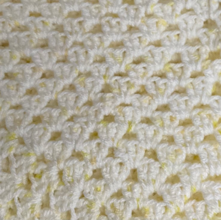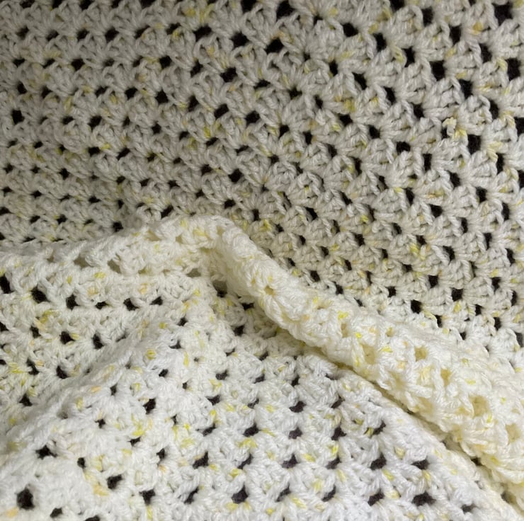 A small crochet blanket, perfect to use as a baby blanket, for a Christening gift or just the right size to double up and drape over knees.