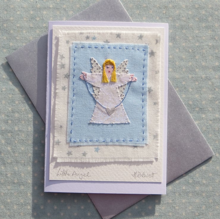 This is a small hand-made greeting card featuring a hand-stitched applique angel made with intricately embroidered details. It is entitled 'Little Angel' and would be perfect for a Thankyou or Birthday, a Guardian Angel for a new baby, etc Definitely a card to keep!