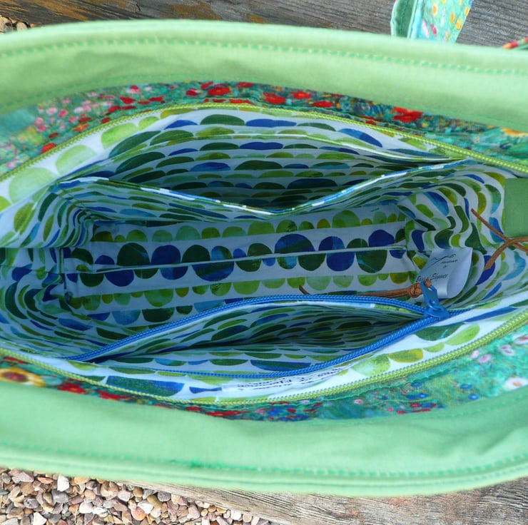 This bag is crafted from a fusion of apple green dry oil cloth waxed canvas and a bright floral water repellent canvas fabric, the bag boasts a spacious front zip pocket and a secure zip-top closure, ensuring easy access and protection for your belongings. The 1.5" wide shoulder strap, enhanced with antique brass hardware, is adjustable for your comfort and crafted with a blend of both fabrics for a sophisticated aesthetic.
