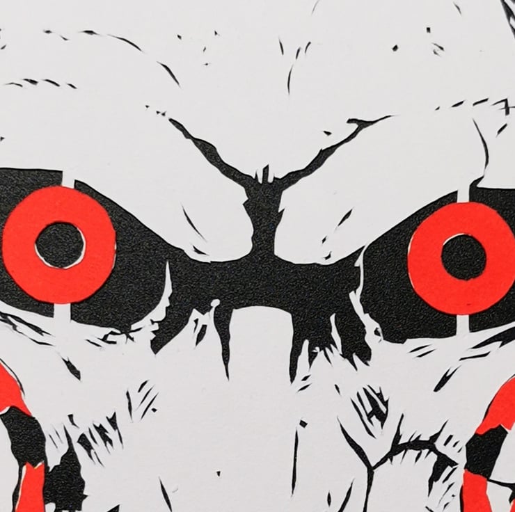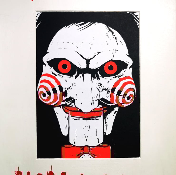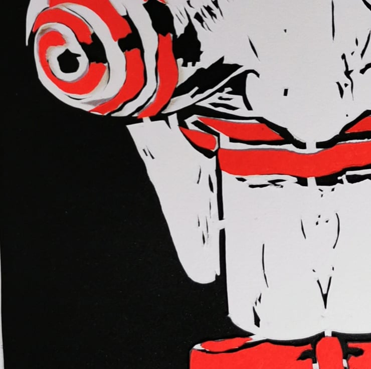 Jigsaw from the Saw franchise of horror films, handmade coloured papercut, layered from white and red paper, set over a black background in a hand-decorated white mount with the famous quote, "I want to play a game"