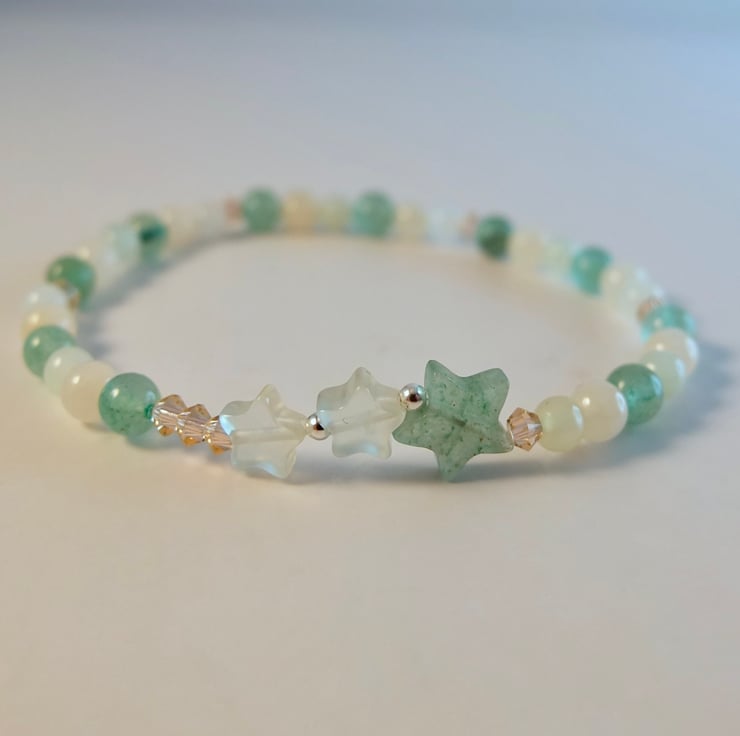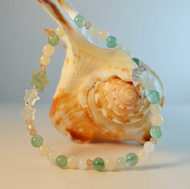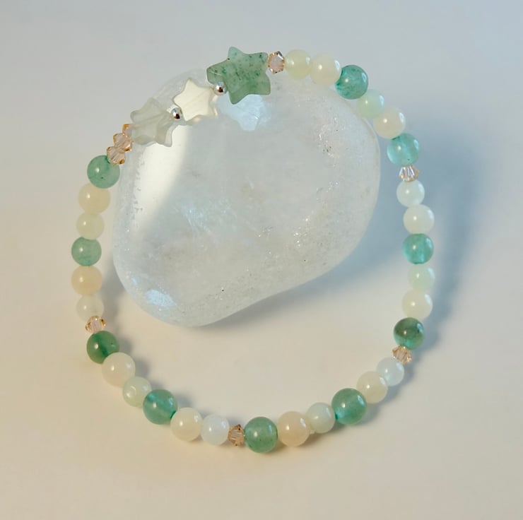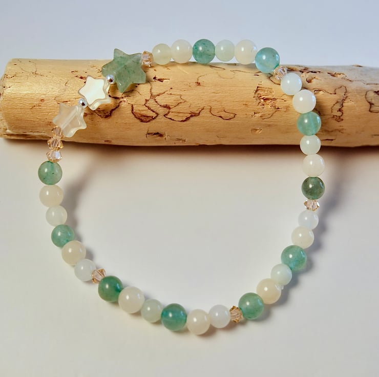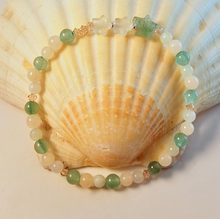 Pretty, dainty bracelet featuring a trio of stars set between 4mm beads of green Aventurine, New Jade and pale peach Mashan Jade.