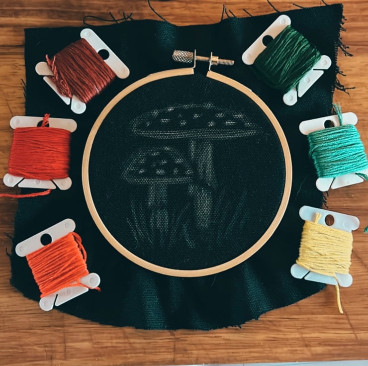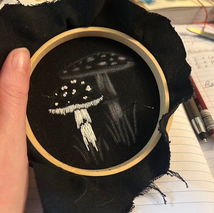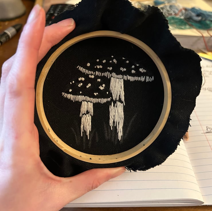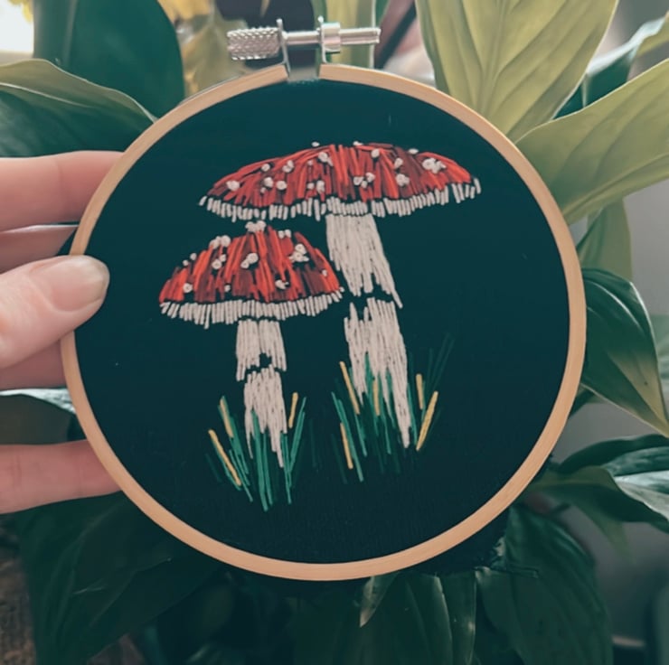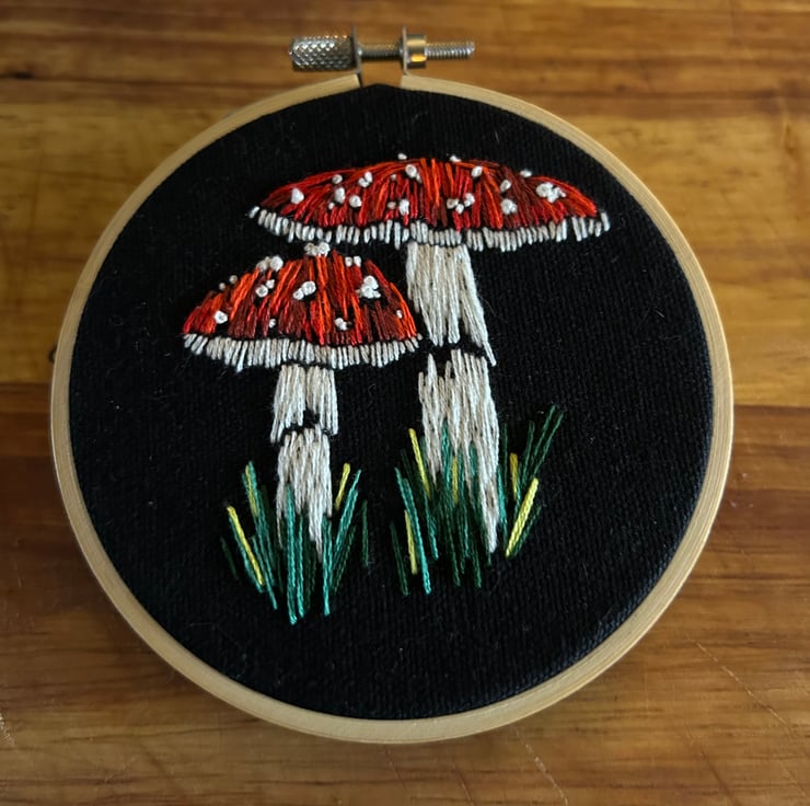 As a ready made completed hoop. Your embroidery piece has been hand stitched onto organic black dyed fabric and framed in a 4 inch bamboo hoop. It comes backed with felt and ready to display on your wall or on a shelf.