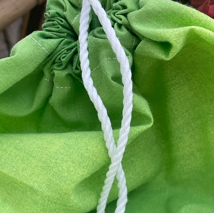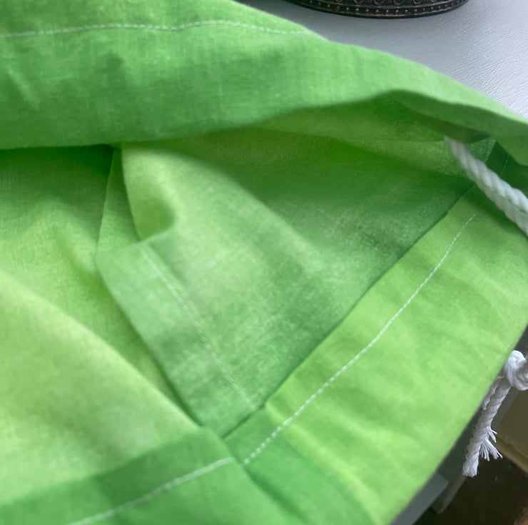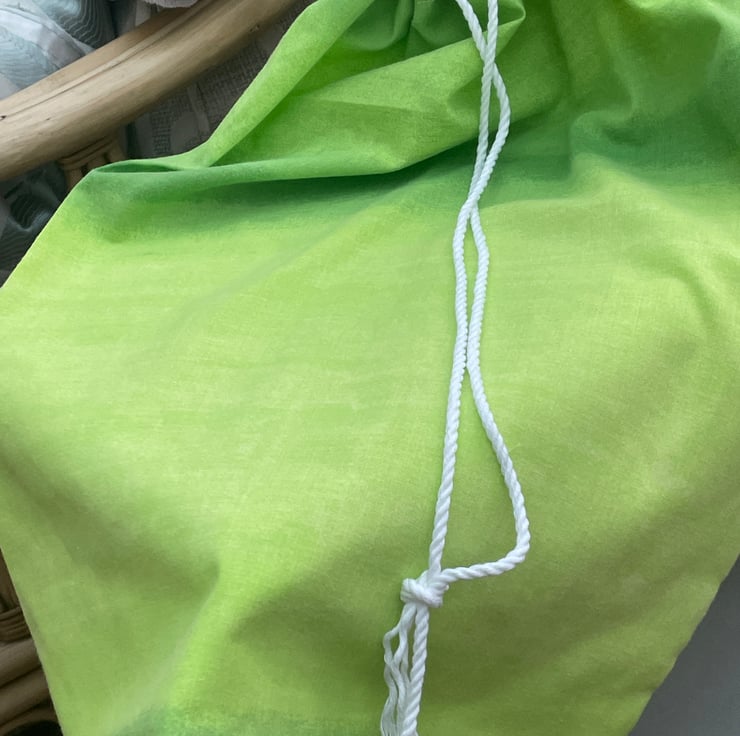 For all the environmentally conscious gift giver or just to be different. The drawstring bag measures 50x38cm approximately so is large enough for lots of gifts. The seams are sewn with a french seam so there are no raw edges and the drawstring is a cotton rope effect string. The bag is great for gifting and is fully reusable. It can then have multiple extra lives as a gift bag again and again or for storage of whatever you want, it's big enough for shoes or a handbag. A true reuse and recycle item. The bag is made from reclaimed polyester cotton so extra friendly for the environment. The colour is green in various shades in a striped pattern so it makes it fairly gender neutral.