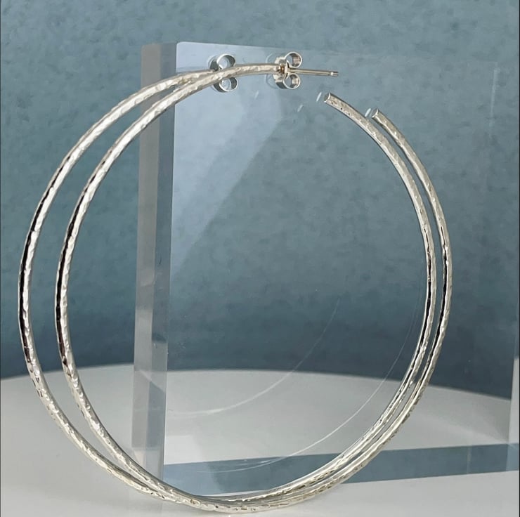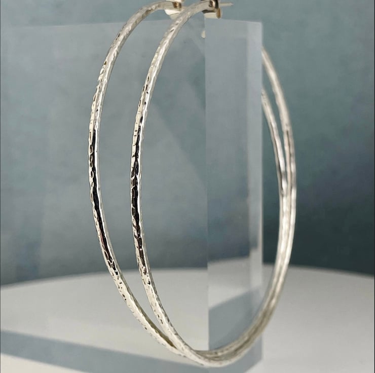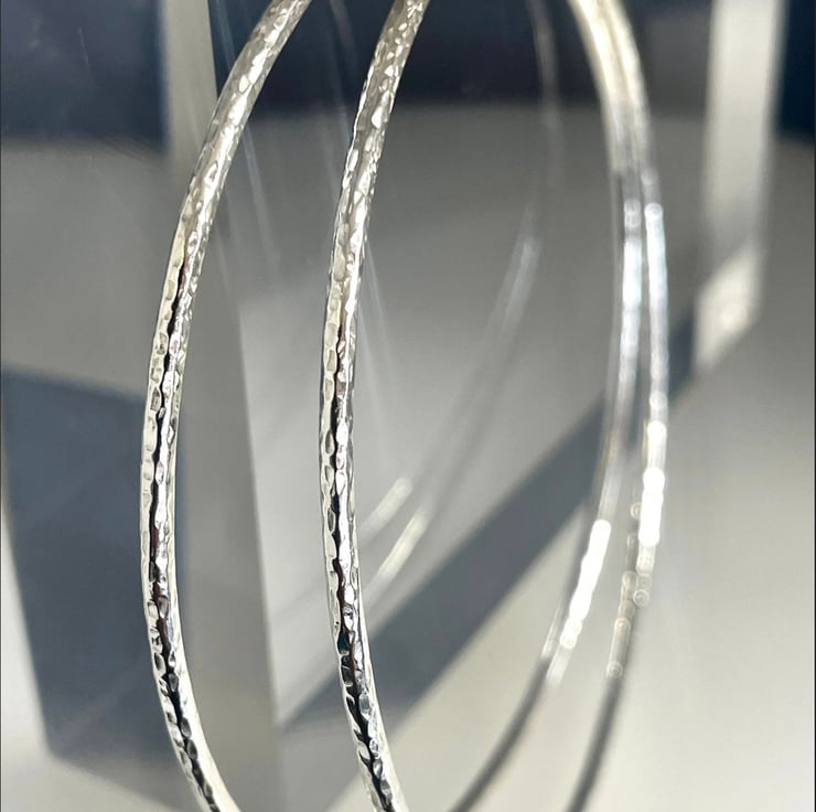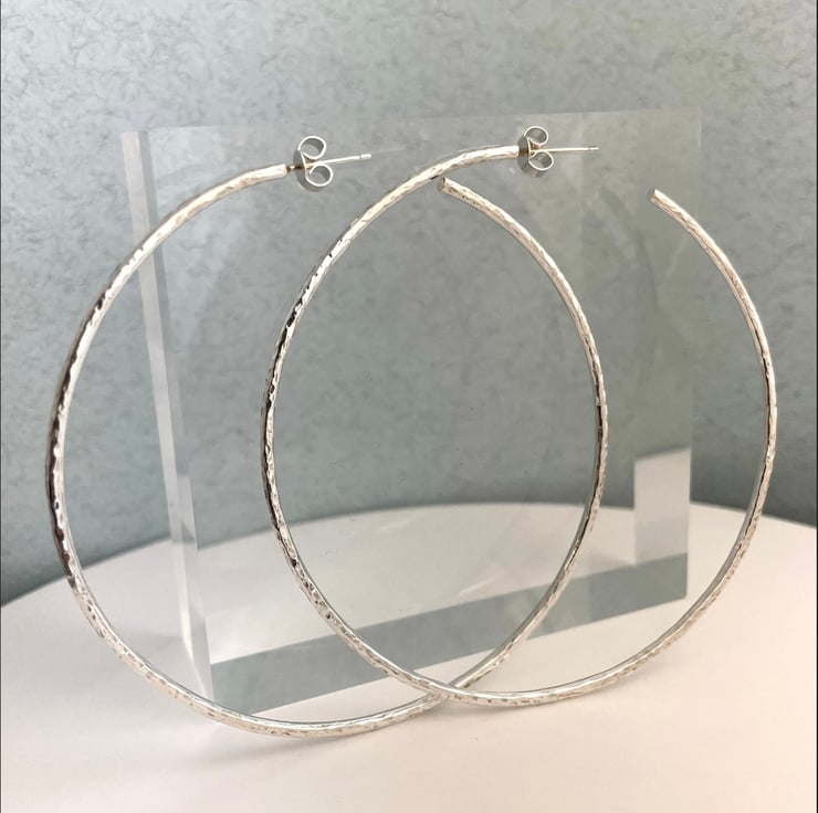 A lovely pair of classic boho hoop earrings handmade from 925 sterling silver. Cut by hand from slim but sturdy solid 1.8mm silver round wire, formed into circular shapes then hammered to create an attractive sparkly surface. They have long silver pin fittings and are secured with stamped (925) silver scroll’s/butterfly’s.