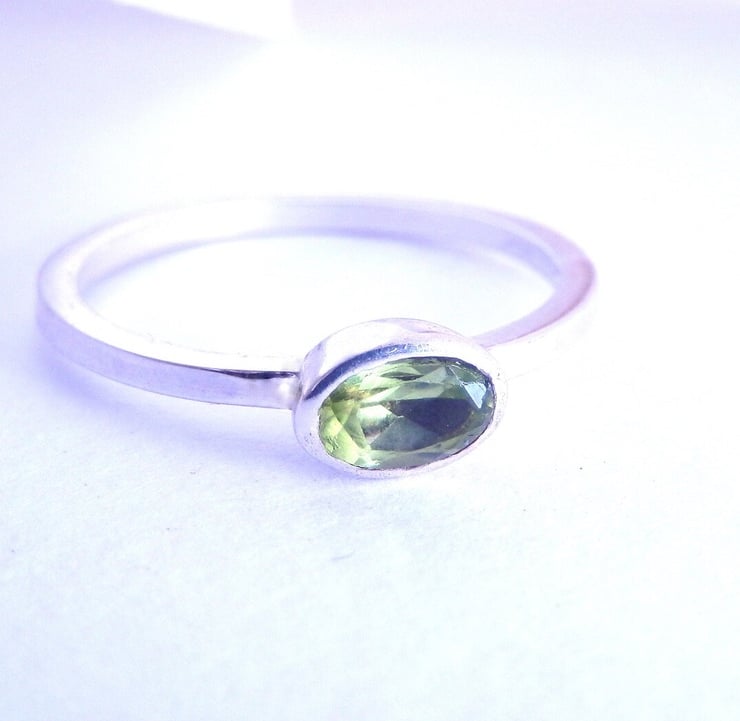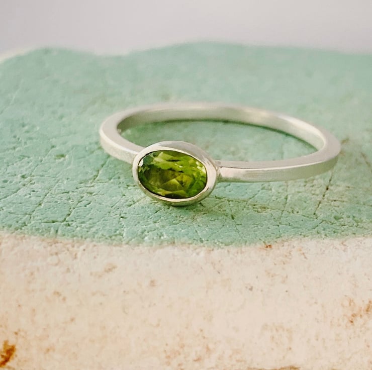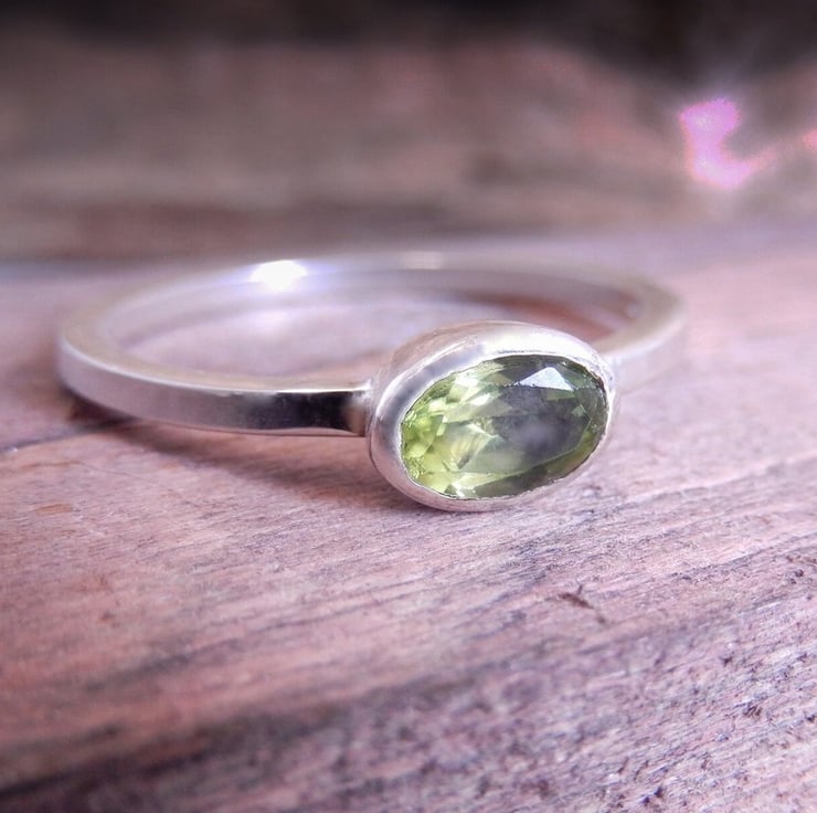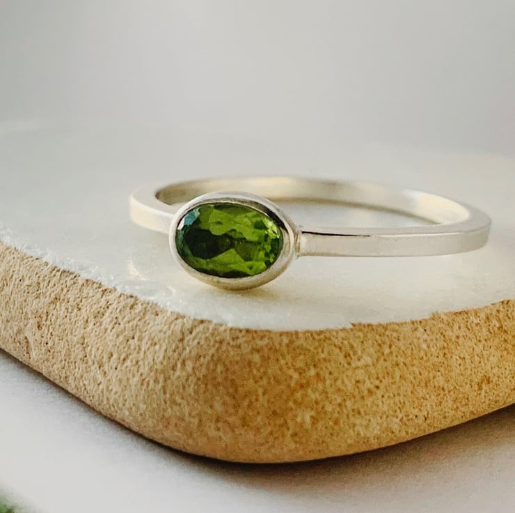 Oval peridot gemstone set into a bezel setting, gemstone 6 x 4 mm faceted oval cut.