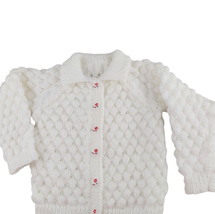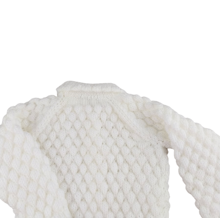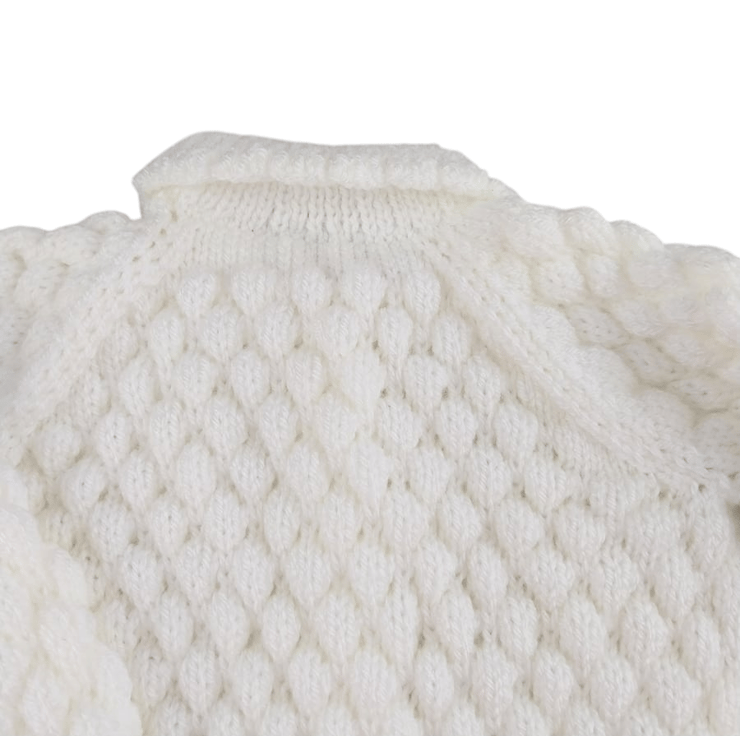 Introducing this charming set—a coordinated white baby cardigan and hat, expertly hand-knitted in a delightful bubble stitch pattern. This unique texture provides a wonderful sensory experience, perfect for your baby's exploration.