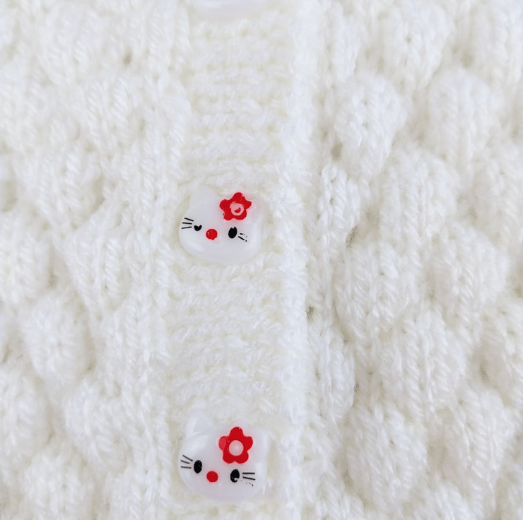 This beautiful white baby cardigan and hat set is meticulously hand-knitted, featuring an eye-catching bubble stitch pattern that adds lovely texture. The cardigan has long raglan sleeves, a classic round neck, and an adorable scalloped collar, secured with sweet cat face buttons. The matching hat, crafted with the same bubble stitch pattern, complements the cardigan perfectly.