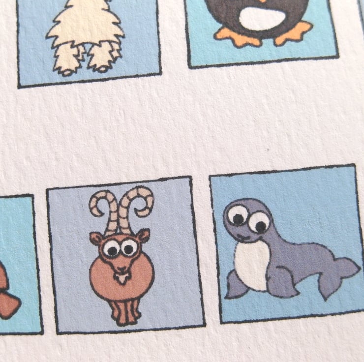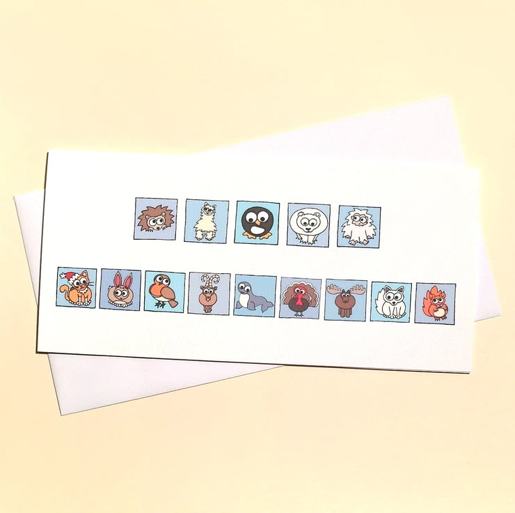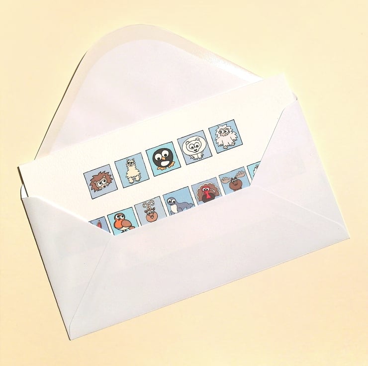 The cartoon animal design by Kim Onyskiw is printed on a long 9.9cm x 21cm white card with a 270gsm weight, and comes with a white DL envelope. Both the card and envelope are 100% recycled. The cryptic card will be packaged in a bio-degradable and compostable vegetable starch bag to keep it protected in the post.