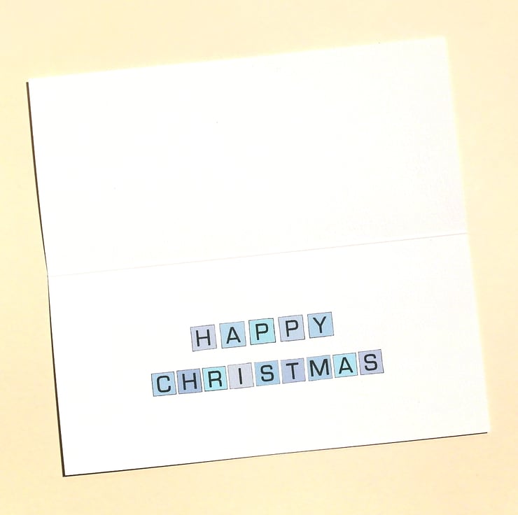A Christmas card featuring a variety of cute animals in blue boxes, with the initial of each creature spelling out the words "Happy Christmas". Perfect for someone who likes a puzzle. Inside the card the message "Happy Christmas" is shown in corresponding blue boxes.