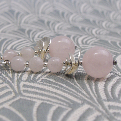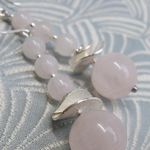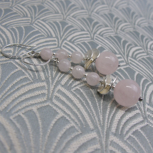 Each or the pink semi-precious rose quartz beads have been spaced with tiny sterling silver spacer beads and at the base of these long drop earrings I have set wavy discs of brushed silver.