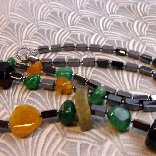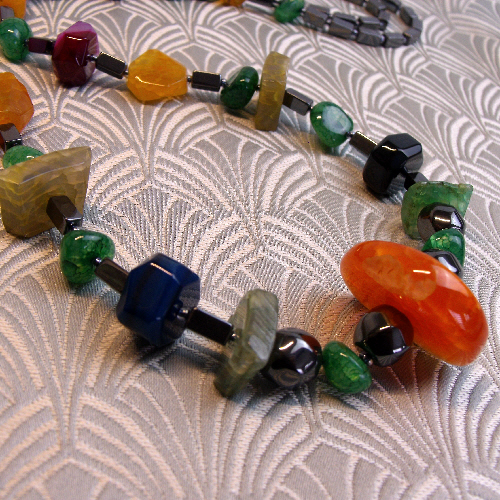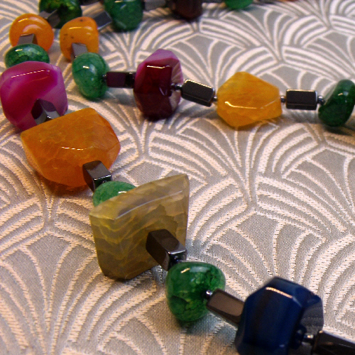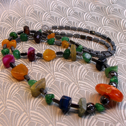 I have used an eclectic mix of brightly coloured semi-precious stone faceted agate nuggets and these have been placed in a long handmade necklace of semi-precious hematite.