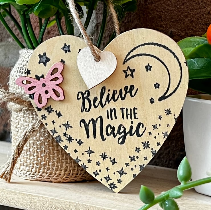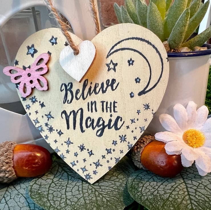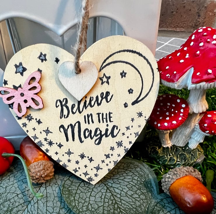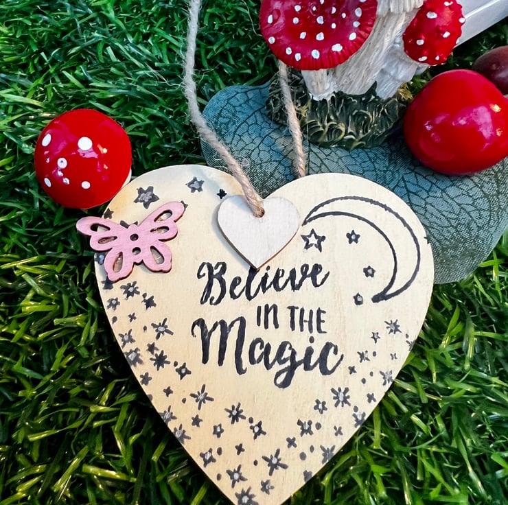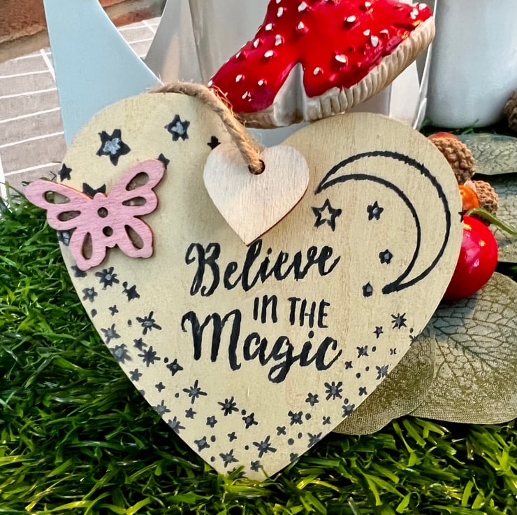 Wooden Hanging Decoration - Fairies ‘Believe in the Magic’. The size of the wooden heart is approximately 7.5x8cm.