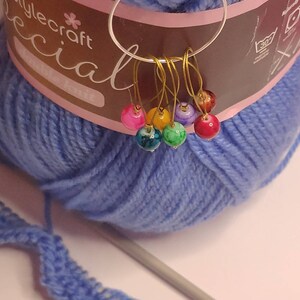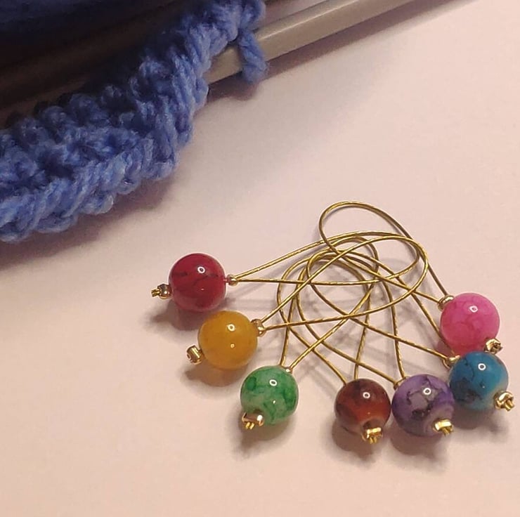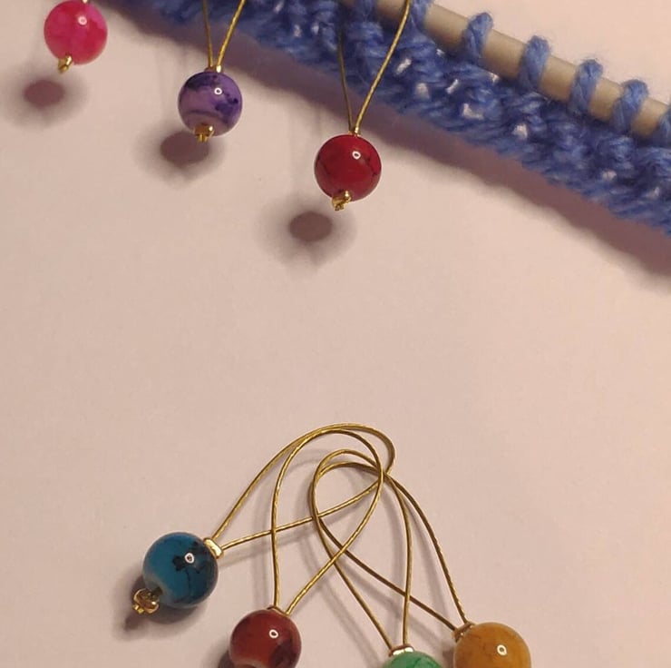 These colourful beaded stitch markers are made with 6mm glass marble beads and plastic coated wire. Perfect for marking when using knitting needles.