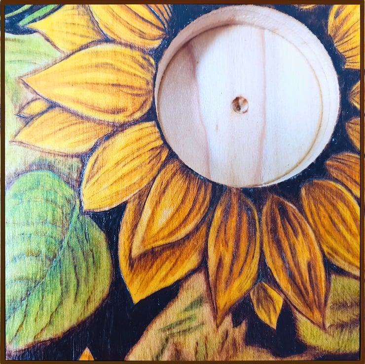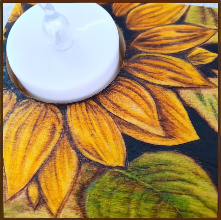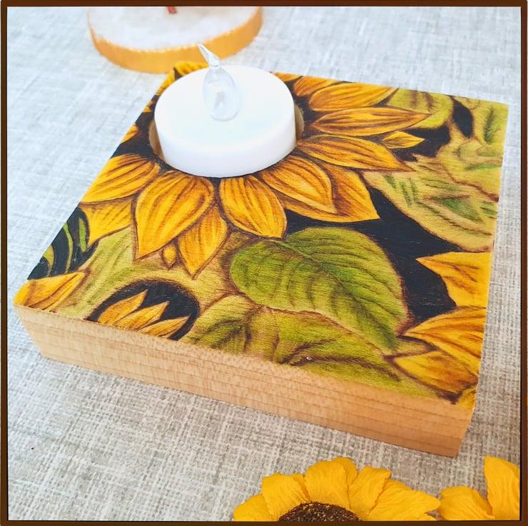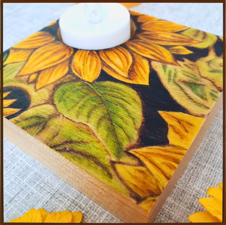 A small, square tealight holder, made from Tulipwood and decorated with the method of Pyrography (wood-burning). It displays an image of sunflowers that has been painted with watercolours. Perfect as a gift or to decorate your own space.