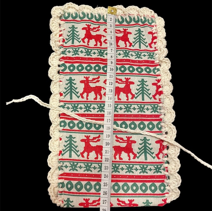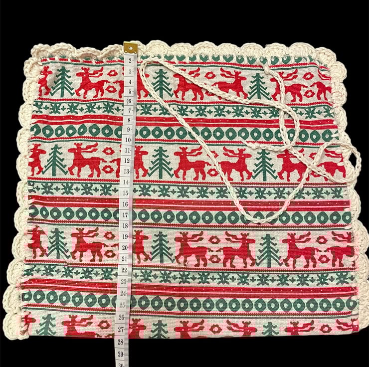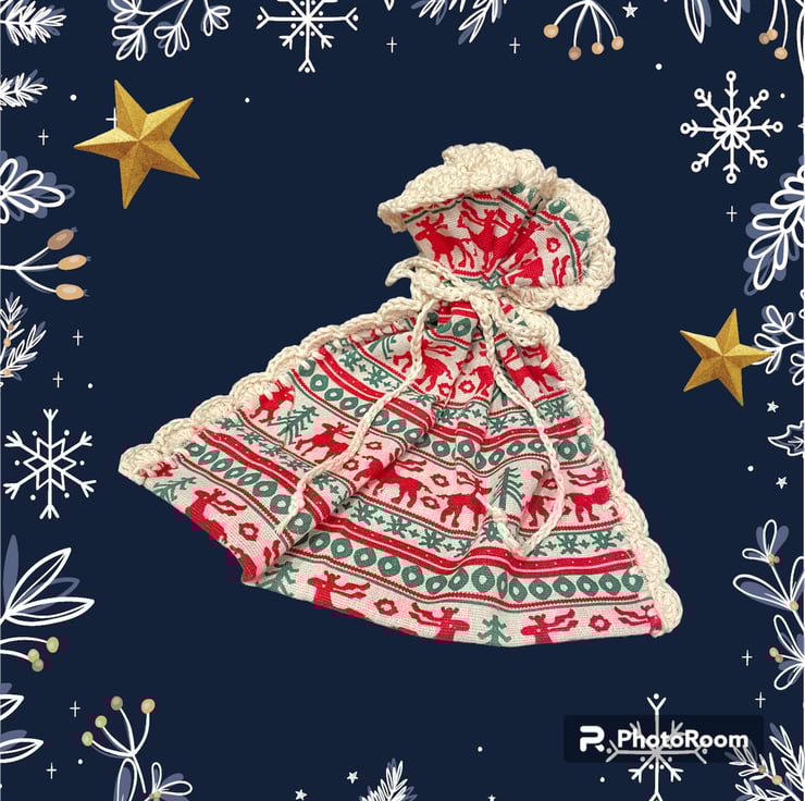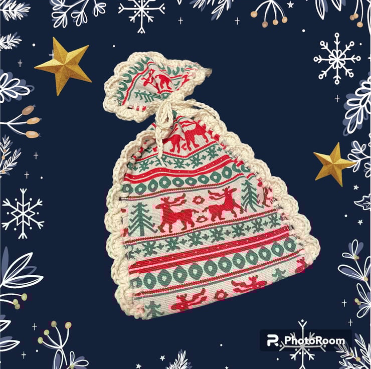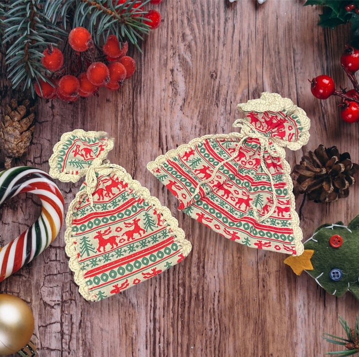 This set of 2 Christmas Gift Bags are handmade with a crochet scallop edge to give them the Rustic Christmas vibe. They are made from a cotton weave fabric, with a crocheted scallop shell trim over the rough edges and includes a simple crochet string to tie the bag close.