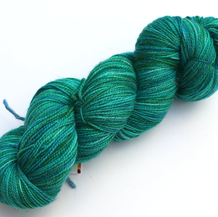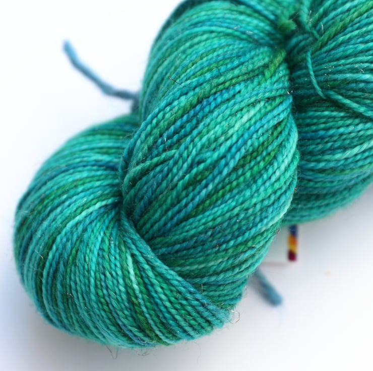 Turquoise, teal, emerald and sea greens with a little teal blue. This is a soft, lustrous 4-ply weight yarn with added bronze stellina sparkles. The dyeing process has caused most of the bronze sparkles to "fade" to silver, so it is still sparkly but mostly silver rather than bronze. Therefore I am offering this skein as a second at a reduced price. Photographs have been taken and edited in bright natural light however this colour is impossible to photograph accurately and the teal/turquoise colours in particular are more saturated in reality.