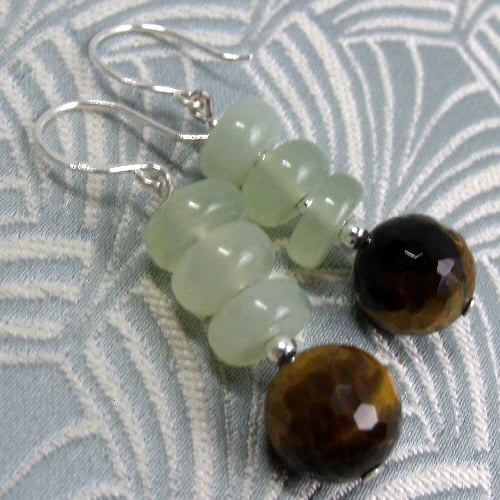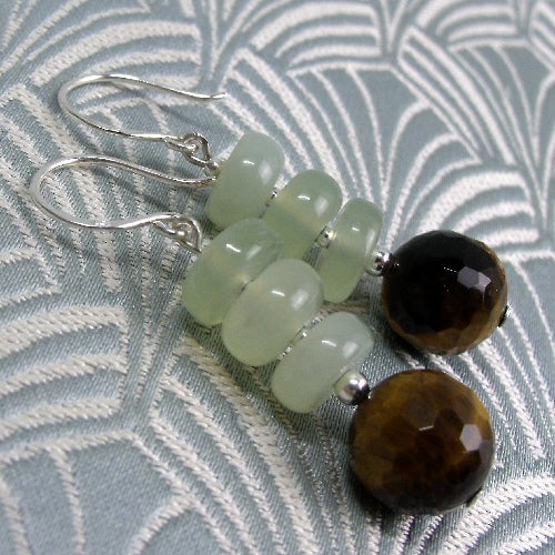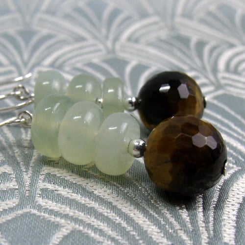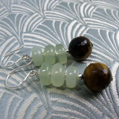 At the base of these semi-precious green jade earrings I have set 12 mm round faceted semi-precious tigers eye beads and the facets of these beautiful semi-precious stone beads reflect the light beautifully.