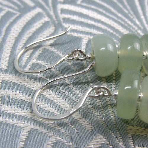 Green jade earrings that have been created from 3 discs of the soft green coloured new jade semi-precious stone discs and each of these green jade discs have been spaced with sterling silver spacer beads.