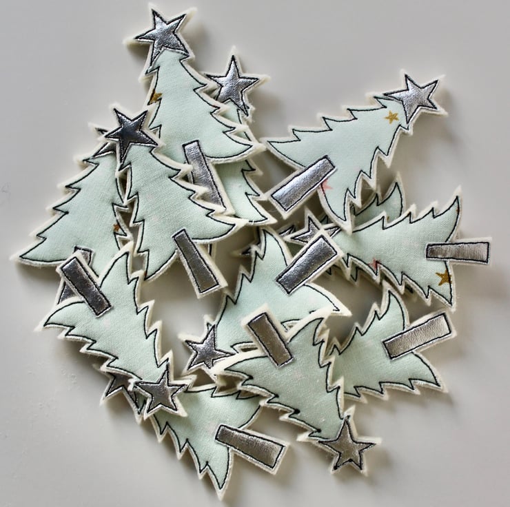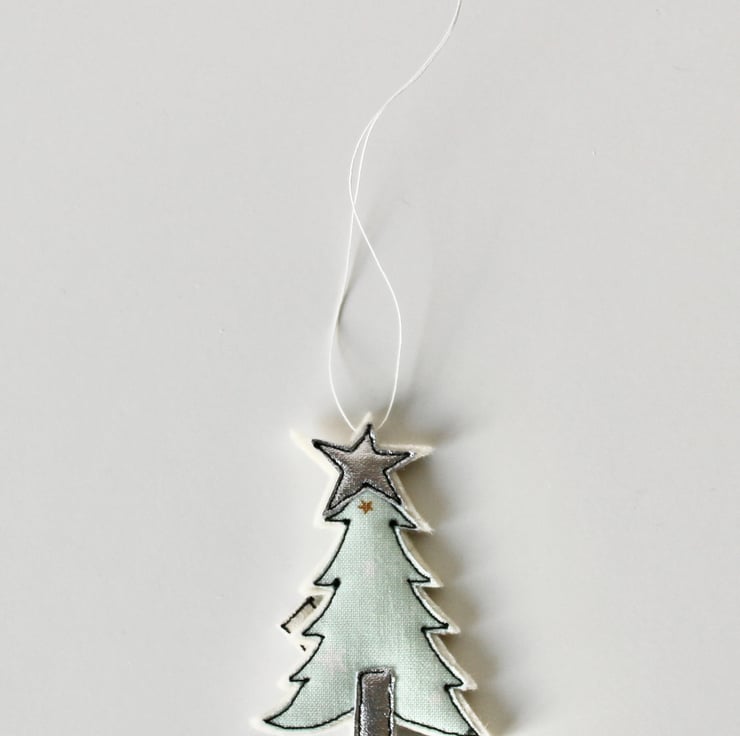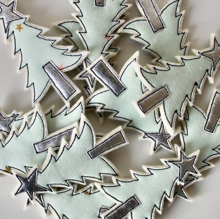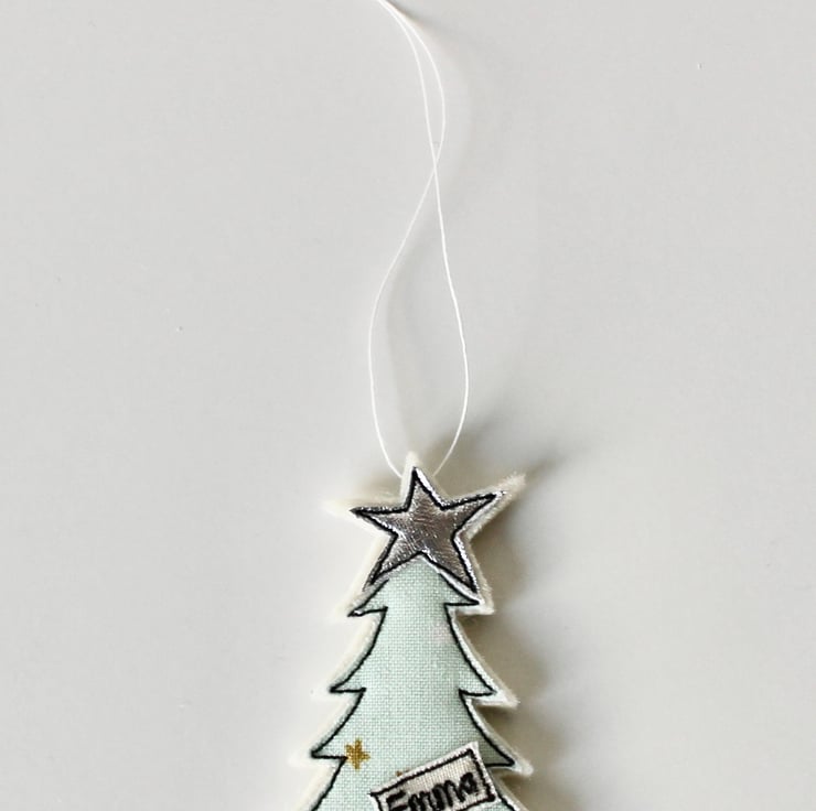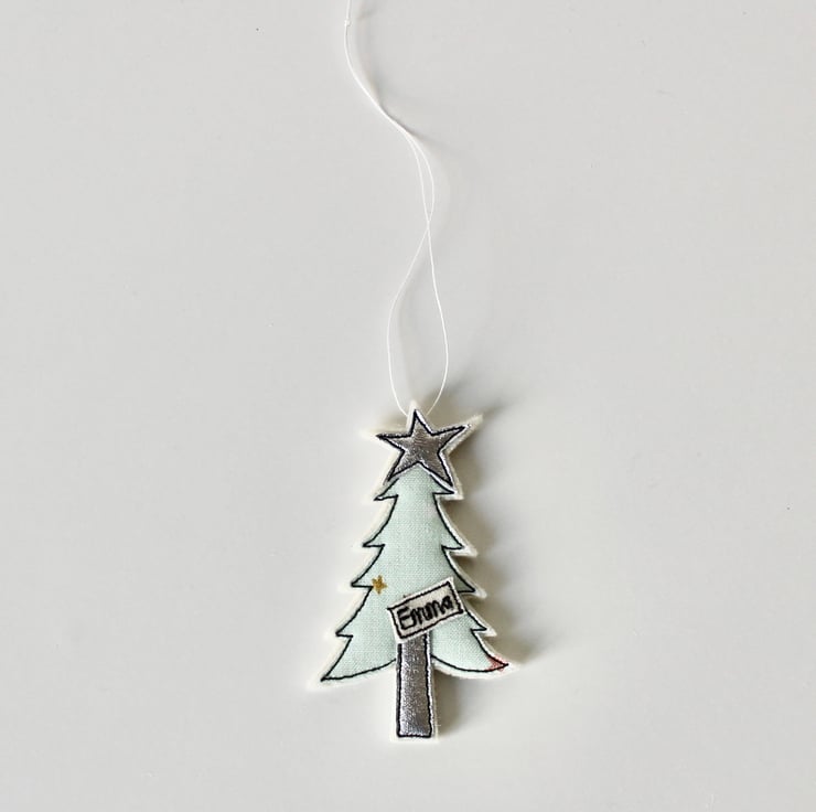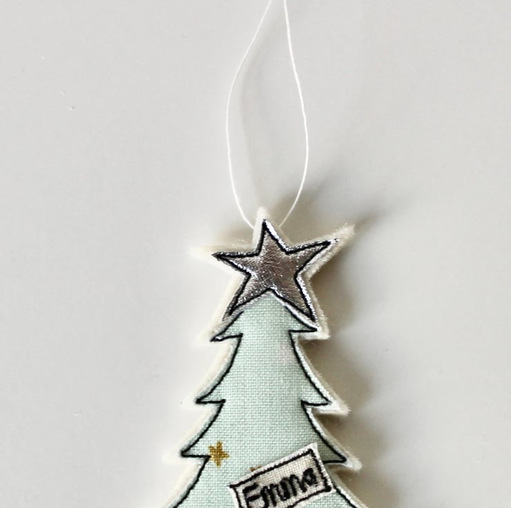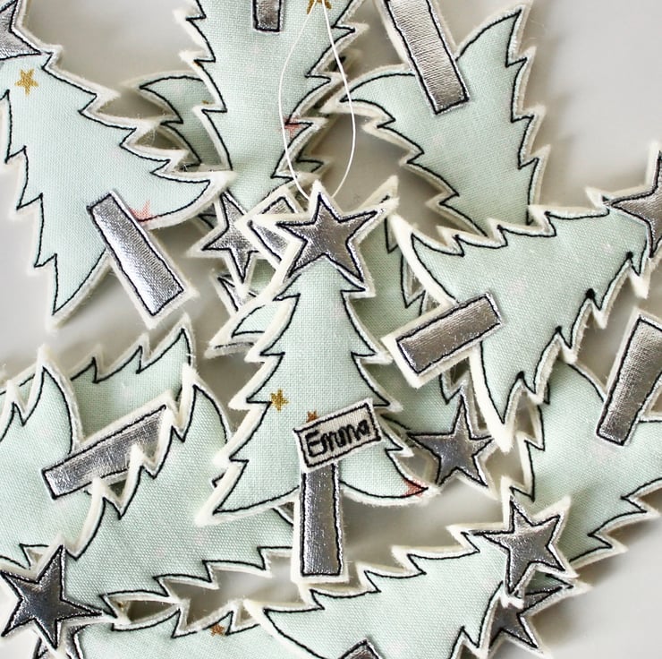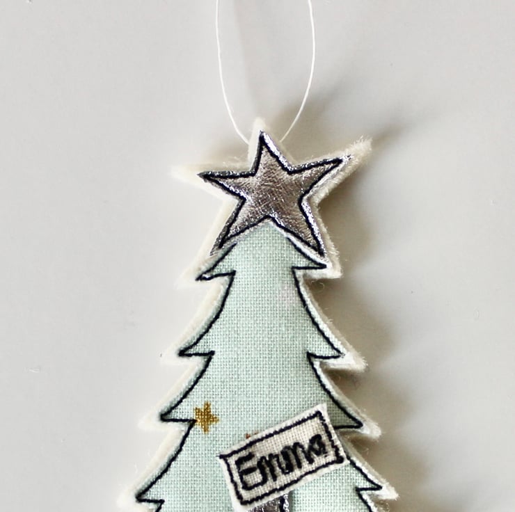 A little tree with a silver cloth star and trunk and a sewn name.