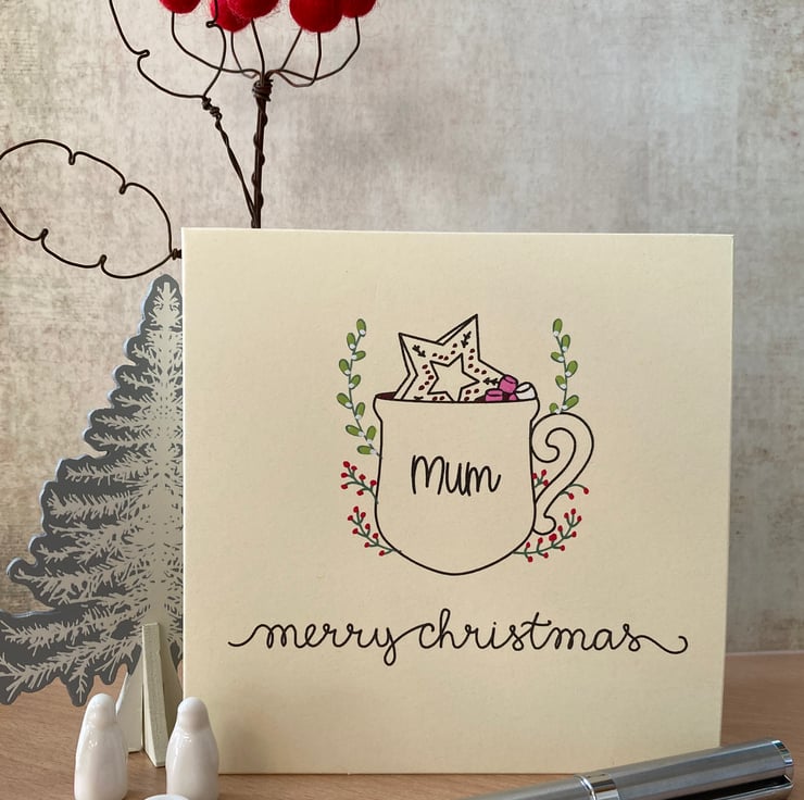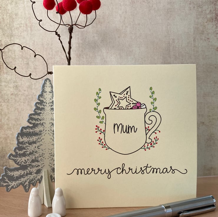 Hand made, hand painted, and made especially for you, with a name of your choosing, my personalised Christmas card features a hot chocolate mug with a a cookie and marshmallows, surrounded by festive foliage. The main design is drawn in glitter gel pen, the stems of the branches in green gel pen before I add the smaller, finer details in bright acrylic paint. Each and every card will be slightly different. Please choose the name you would like added in the centre of the 'mug' - up to 7 letters/spaces fit best.