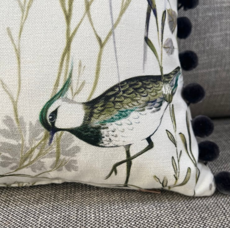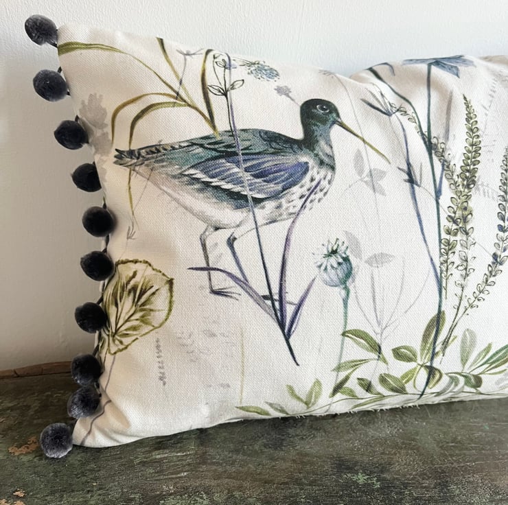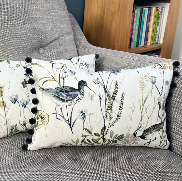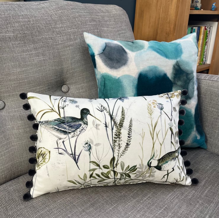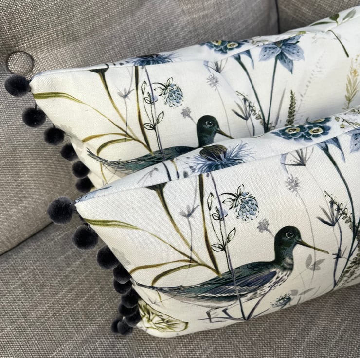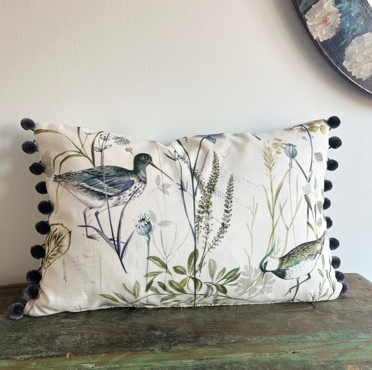 Beautiful double sided cushion cover in Wetlands fabric with birds, grasses and flowers in shades of blue and green on a pale background. The rectangular cushion cover is trimmed on the ends with charcoal grey velvety pompoms.