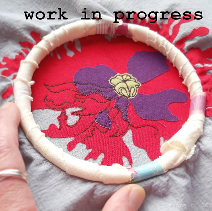 original floral textile art - free motion embroidered raw edge applique, with hand embroidered embellishments, in an 8" painted hoop.