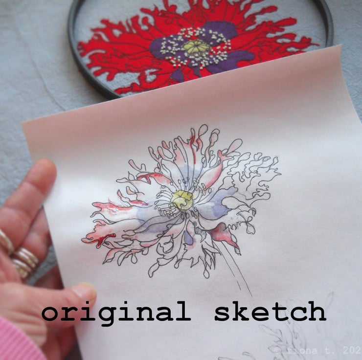 translated from my original sketch this frilly poppy is free hand embroidered in bright red cotton on to hand dyed grey cotton calico.