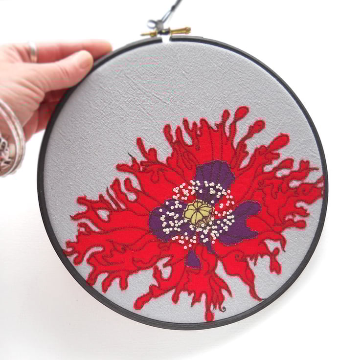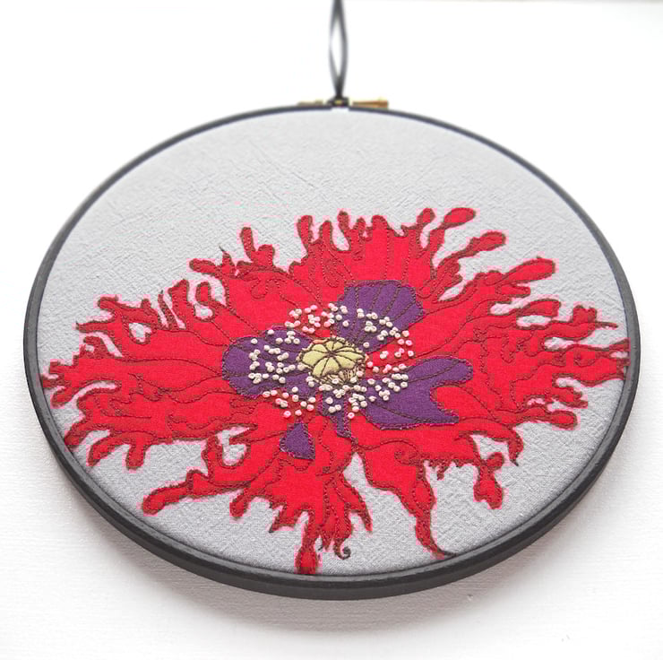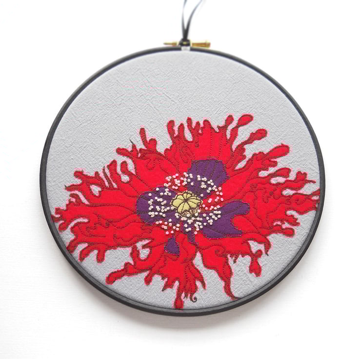 8 inch free motion and hand embroidered floral textile hoop original red poppy