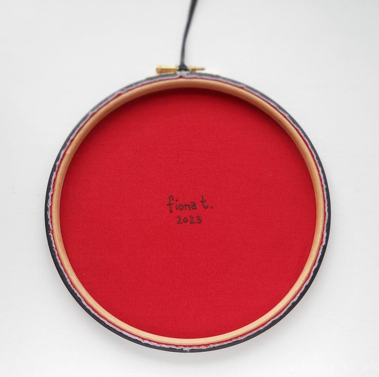 this textile sketch is mounted in an 8" black painted bamboo hoop, and is signed & dated on the reverse, in freehand stitched text, on a coordinating red cotton.