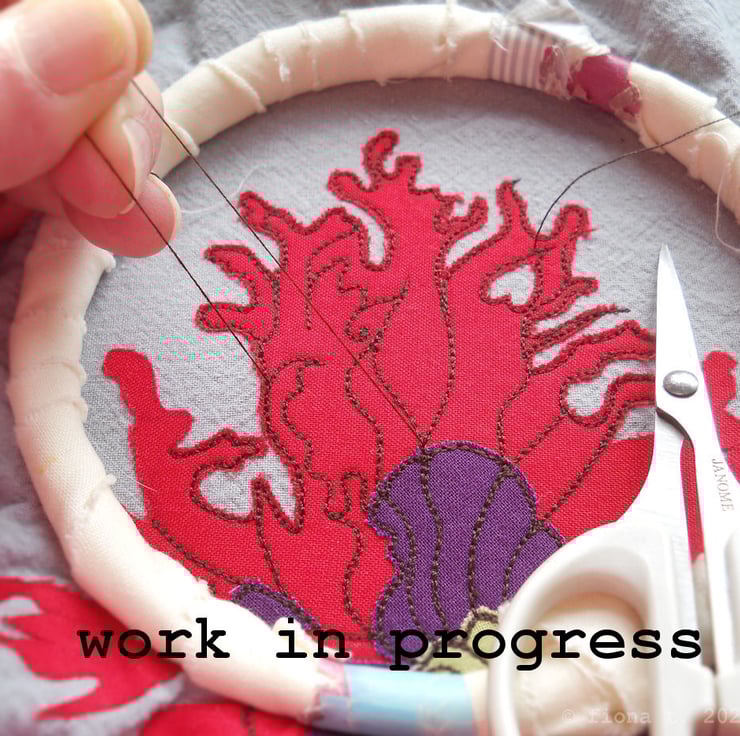the fabric is hand cut, layered and appliqued onto calico, before drawing the details on freehand, using free motion embroidery.