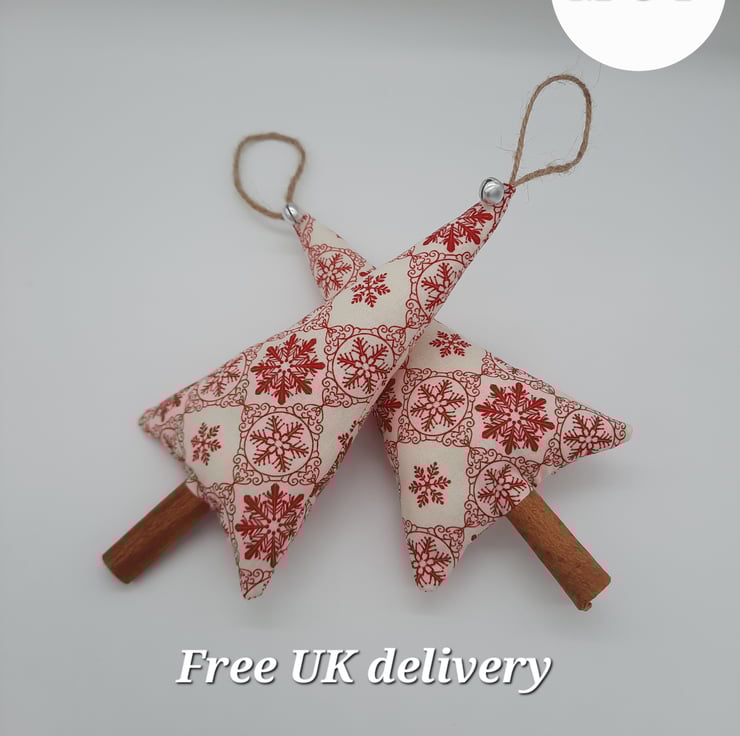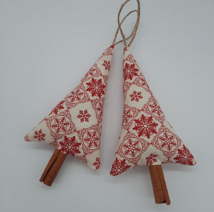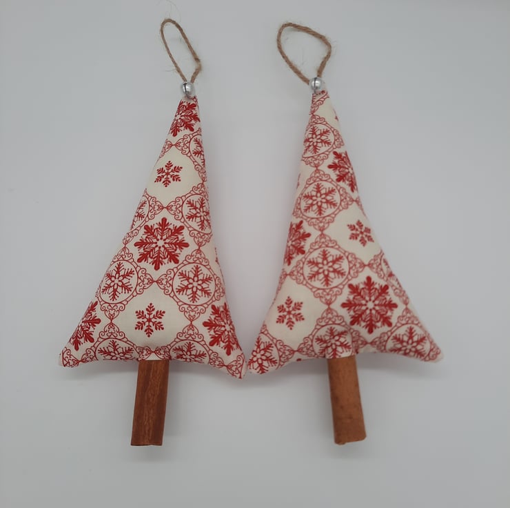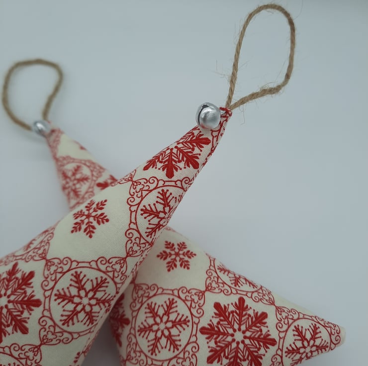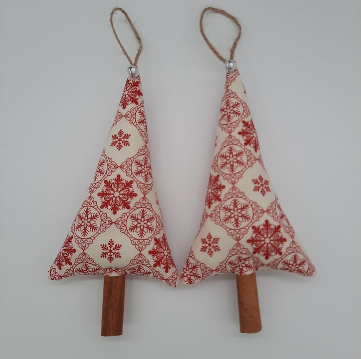 Cream and red snowflake fabric Christmas tree hangers.