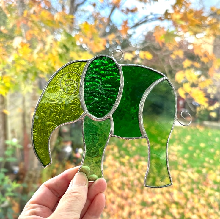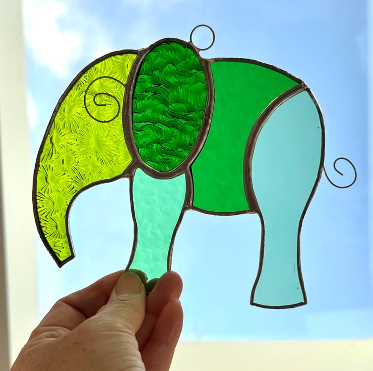 This glass elephant suncatcher has been made using 5 types of green glass.
