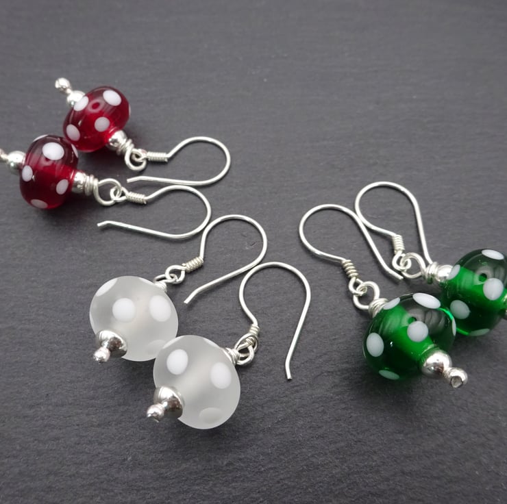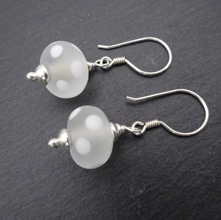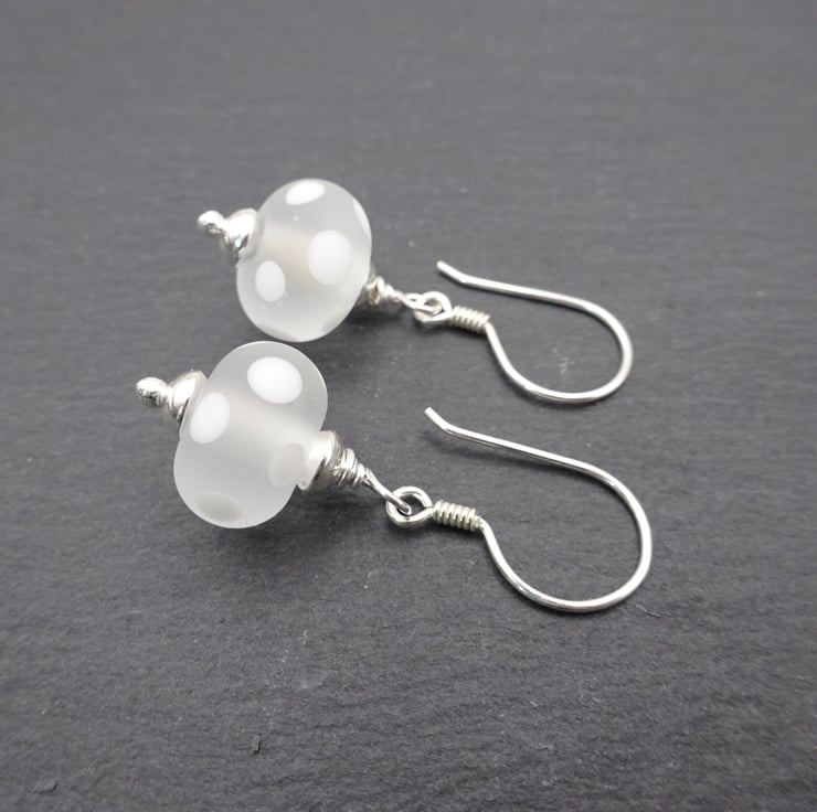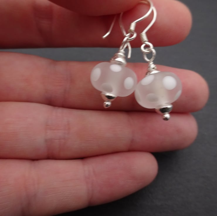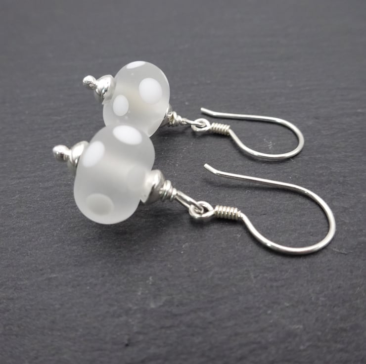 A pair of earrings made with sterling silver ear wires and handmade lampwork glass beads.