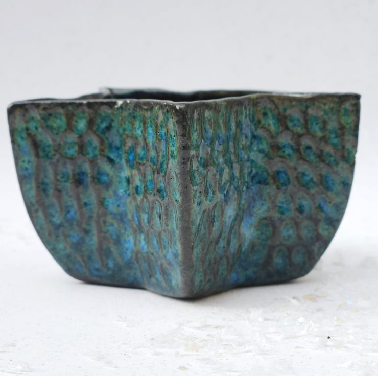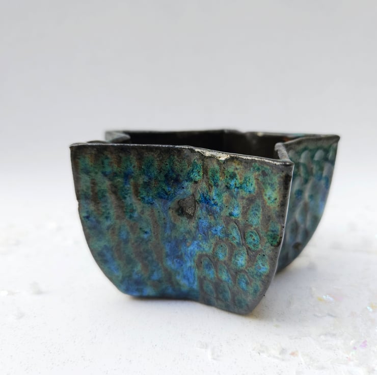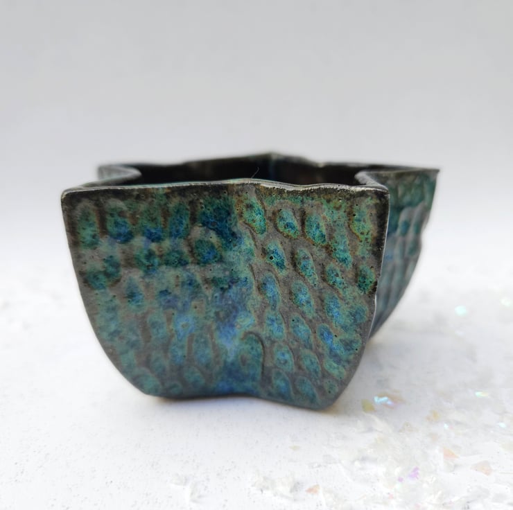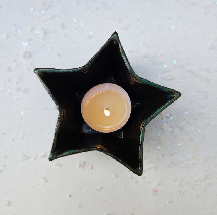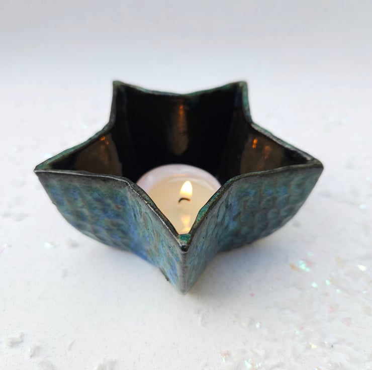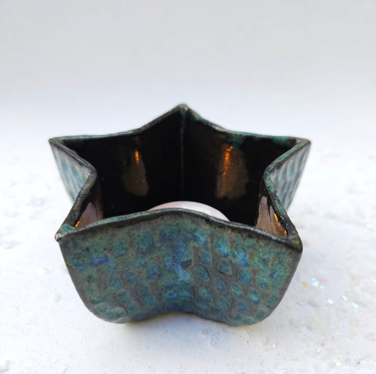 In my pottery studio, black clay transforms into my new "From the Sea" star candle holders. These have been inspired by coastal erosion and weathering. Each piece, from molding to carving, represents the textured beauty found along our shores. Bisque firing marks the first step, followed by delicate sanding. The star is glazed inside with a clear glaze, which reflects the tealight, and the outside is glazed with a gorgeous blue/green.
