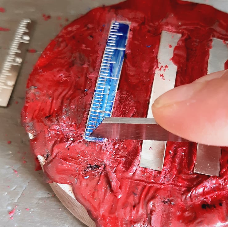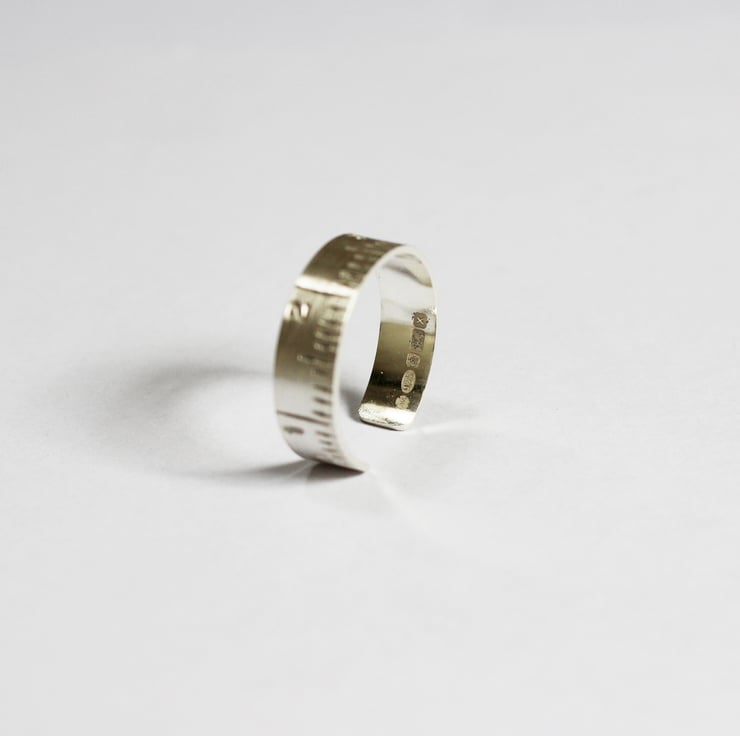 I work with a strip of sterling silver, I hand-engrave the markings, hand-punch the letters and this ring is polished before the outer surface is given a brushed finish.