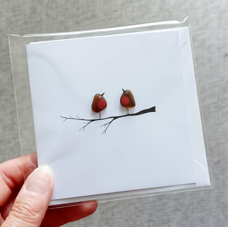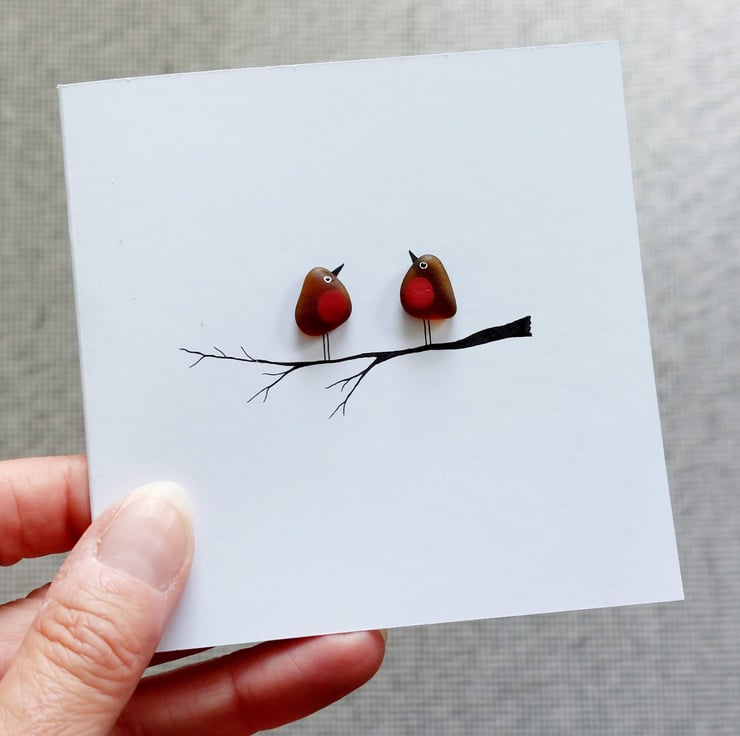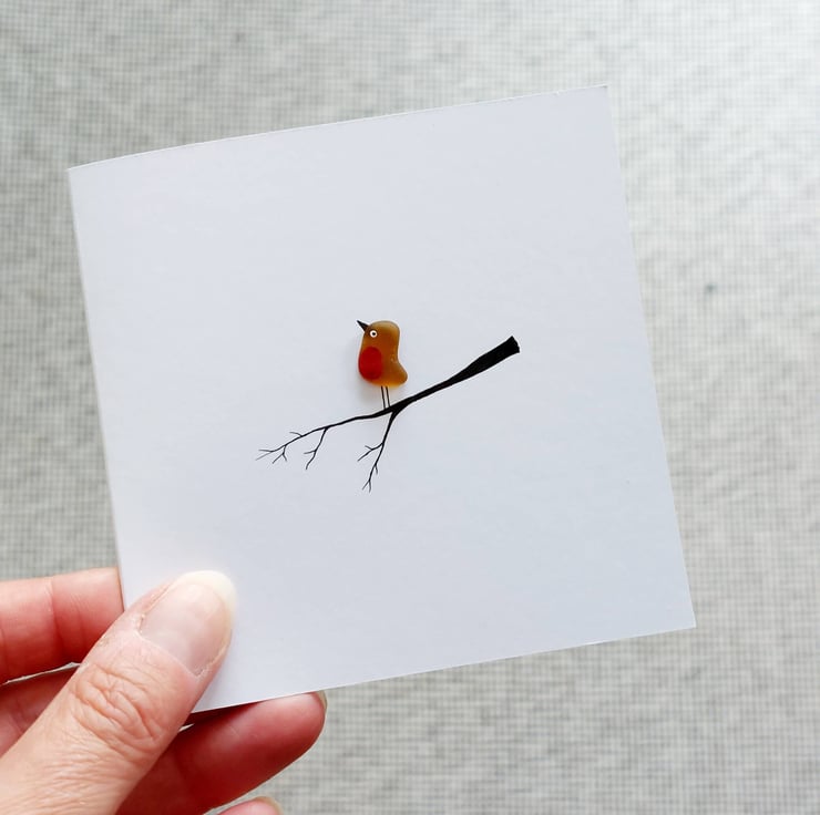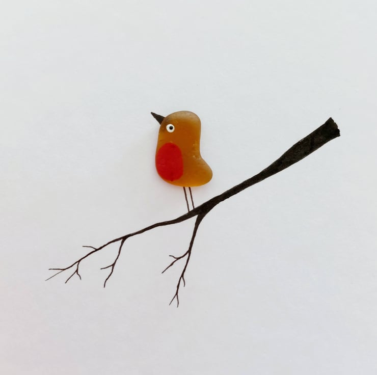 This hand drawn sea glass greetings card shows a beautifully simple, yet heartfelt design of a sea glass robin perched on a branch - choose from either 1 or 2 robins on your card. The robins are crafted from a single piece of hand picked, perfectly tumbled brown sea glass from Seaham in the north east of England and features a hand painted red breast, eyes and a beak. The remainder of the card has been hand drawn and the inside is blank for your own message. This card is perfect for Christmas, bereavement, in memory, sympathy or just to say 'I am thinking of you'.