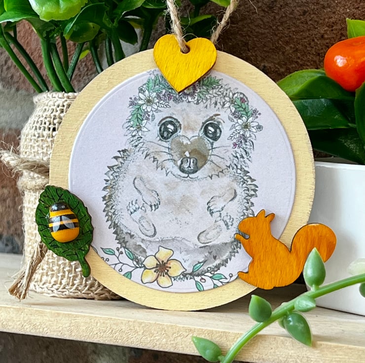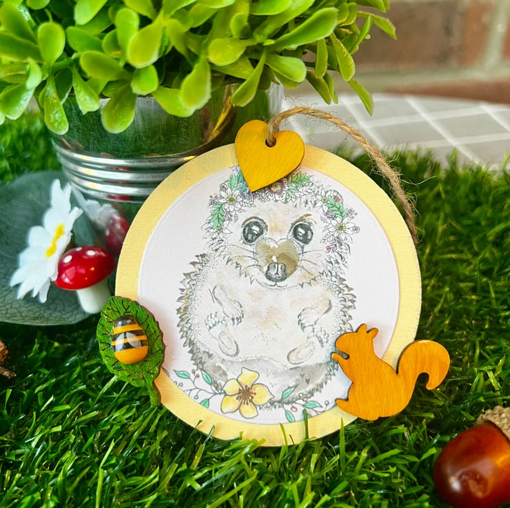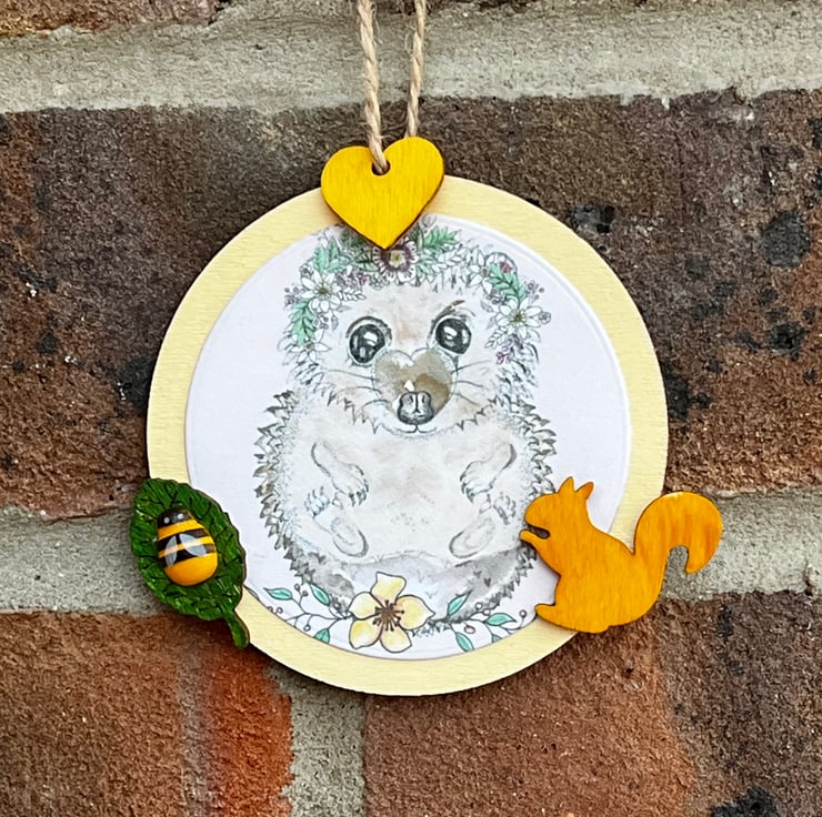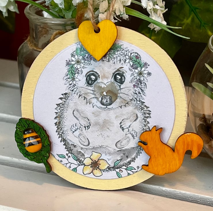 ‘Wooden hanging decoration’ - Artists Illustration of a hedgehog with squirrel. This image is a colour print of my pen illustration featuring a cute hedgehog. It has been printed on 120gsm ultra-bright silky paper and placed on a 8x8cm approximate wooden circle. It is then finished with small wooden decorative crafts including a squirrel. This item is handmade & hand painted with acrylic paints.