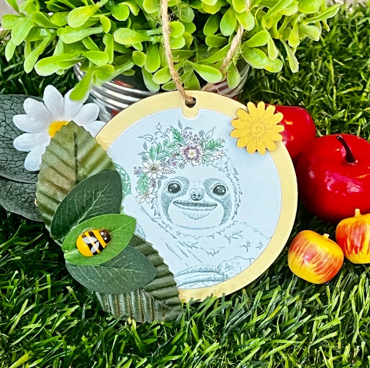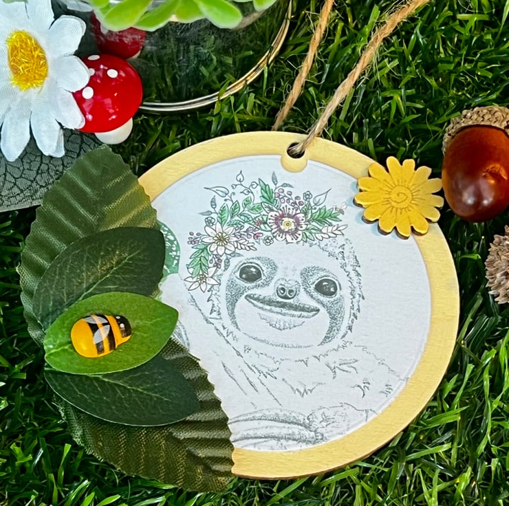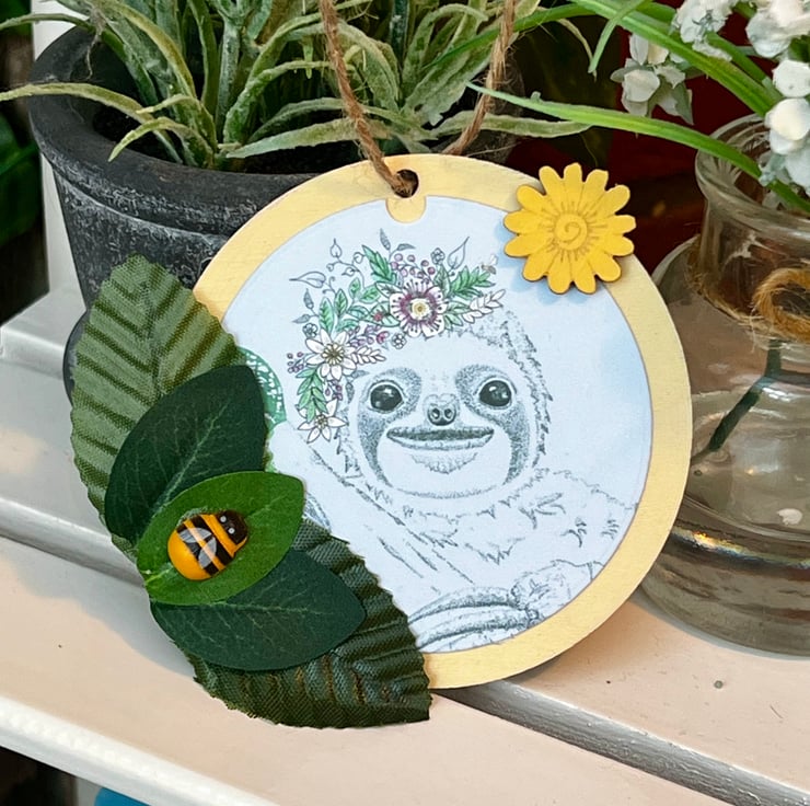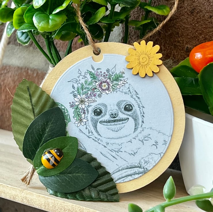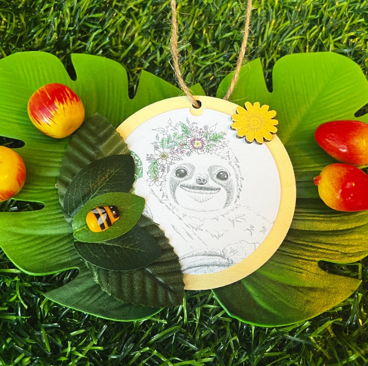 Wooden hanging decoration - Artists Illustration of a ‘Smiling Sloth’. This image is a colour print of my pen illustration featuring a cute happy sloth. It has been printed on 120gsm ultra-bright silky paper and placed on a 8x8cm approximate wooden circle. It is then finished with decorative leaves & small wooden crafts including a bee. This item is handmade & hand painted with acrylic paints.