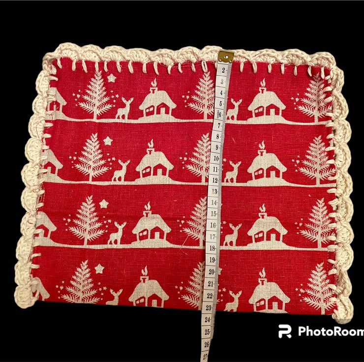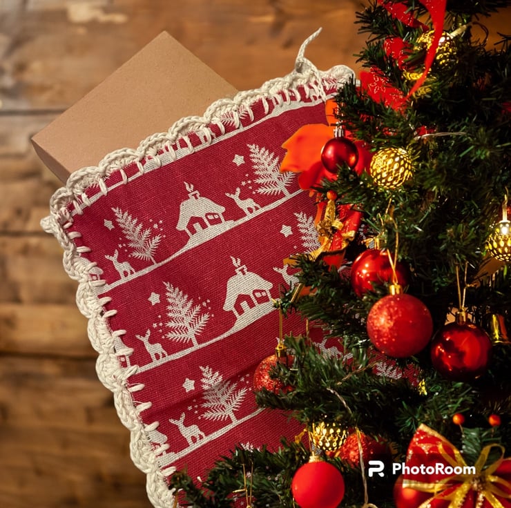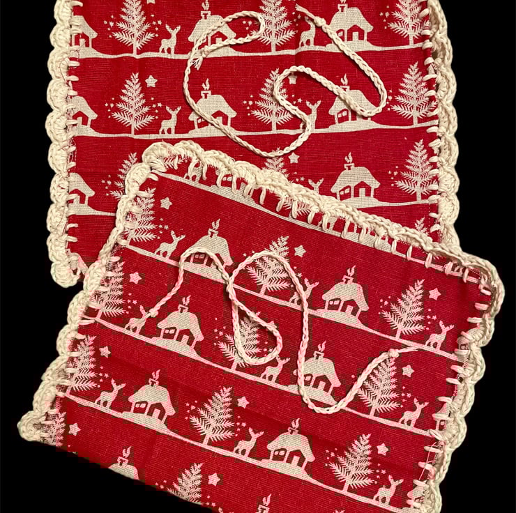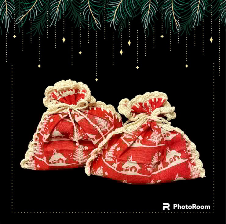 This set of 2 Christmas Gift Bags are handmade with a crochet scallop edge to give them the Rustic Christmas vibe. They are made from a cotton weave fabric, with a crocheted scallop shell trim over the rough edges and includes a simple crochet string to tie the bag close.