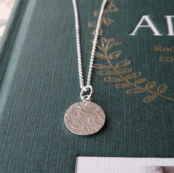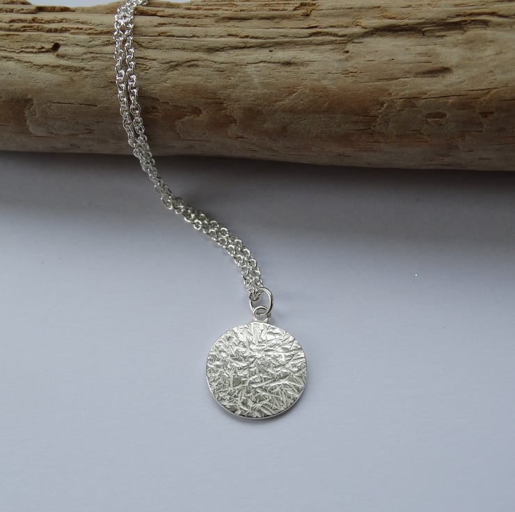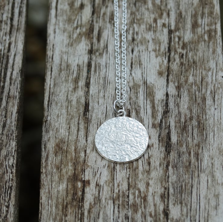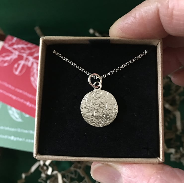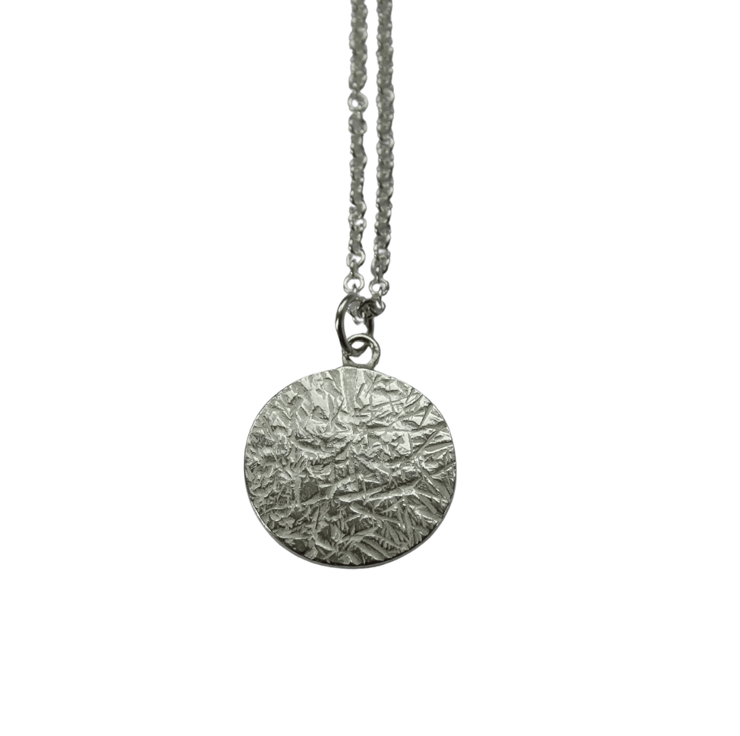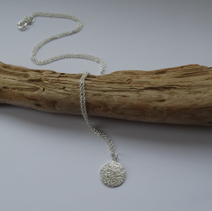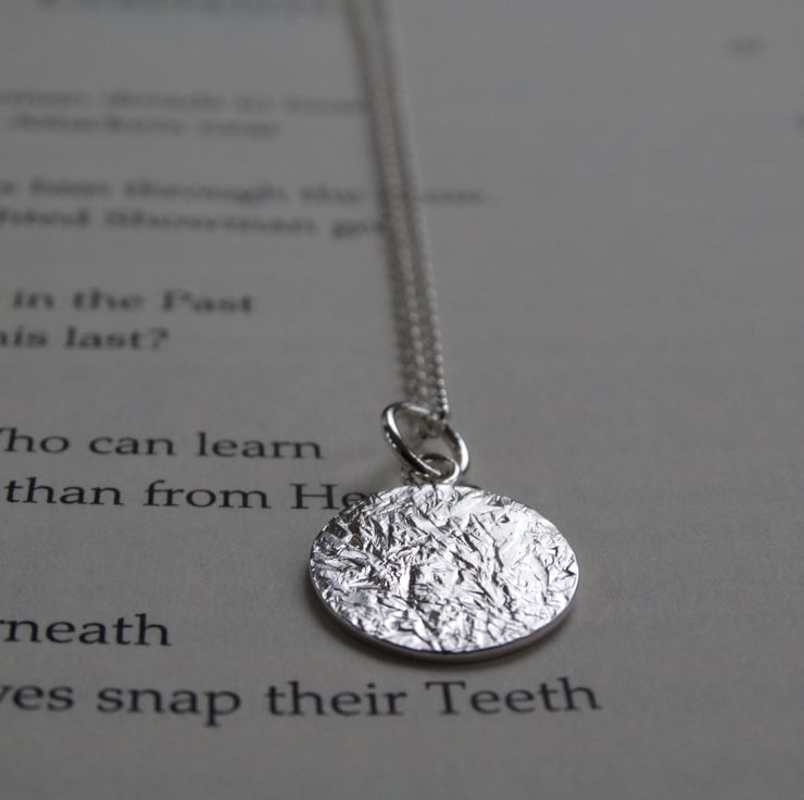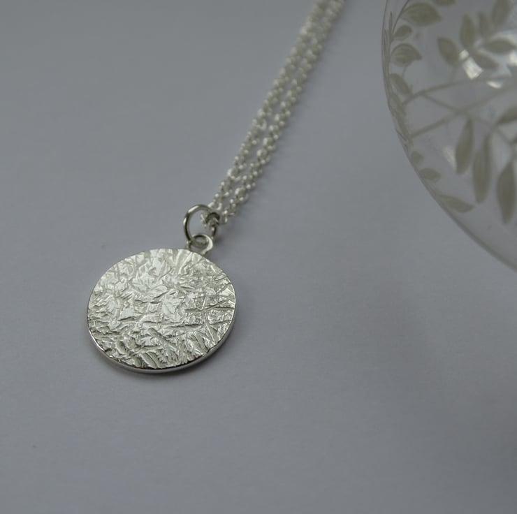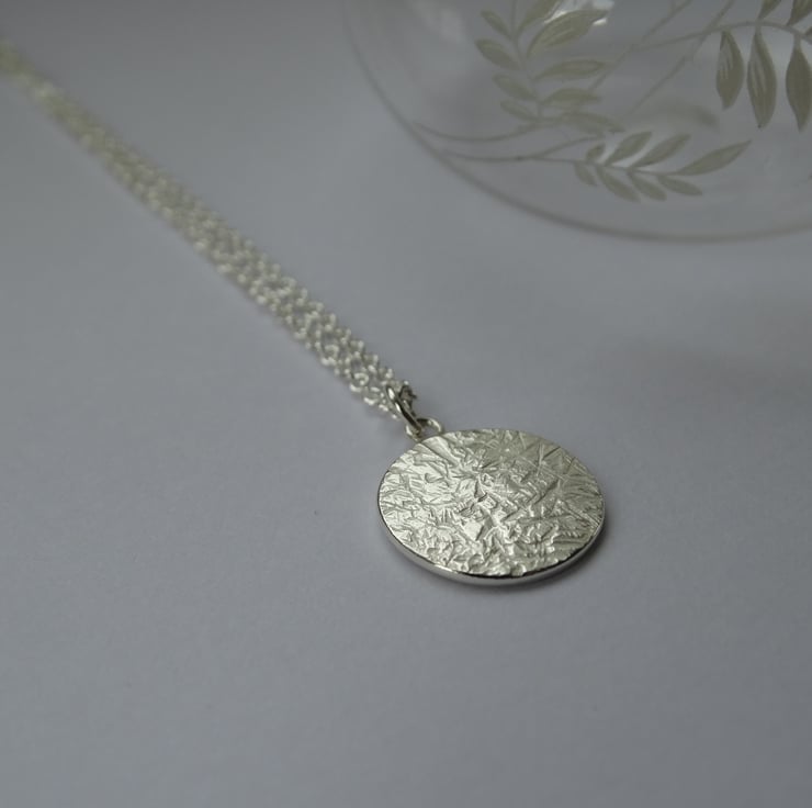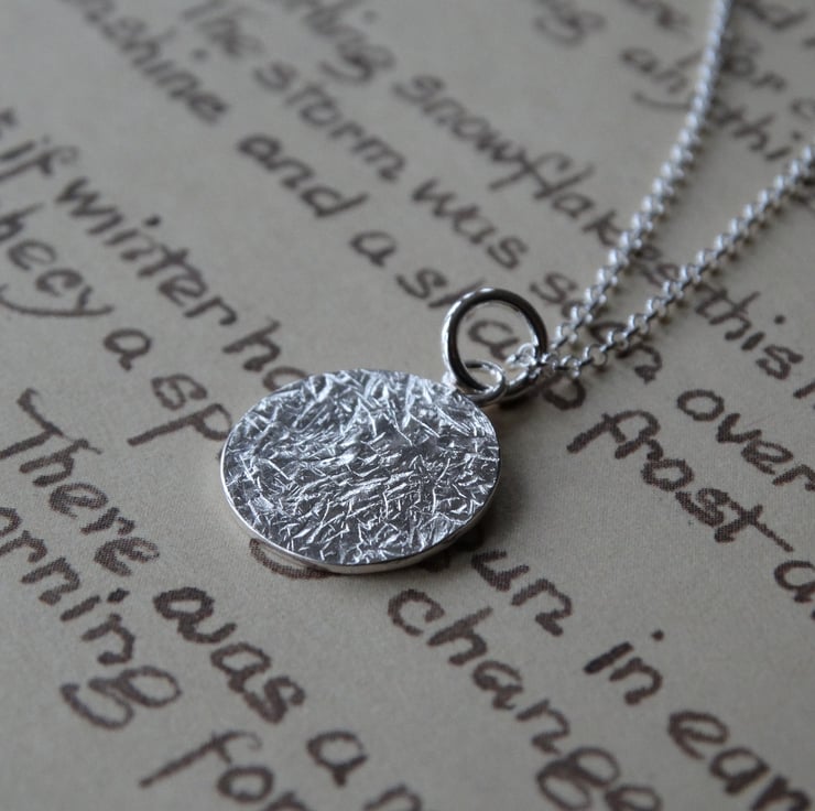 This pretty pendant is inspired by the winter solstice, but looks lovely worn at any time of year. The disc represents the sun, and the mottled texture, which has been applied by hand, is inspired by the thick hoar frosts of midwinter.